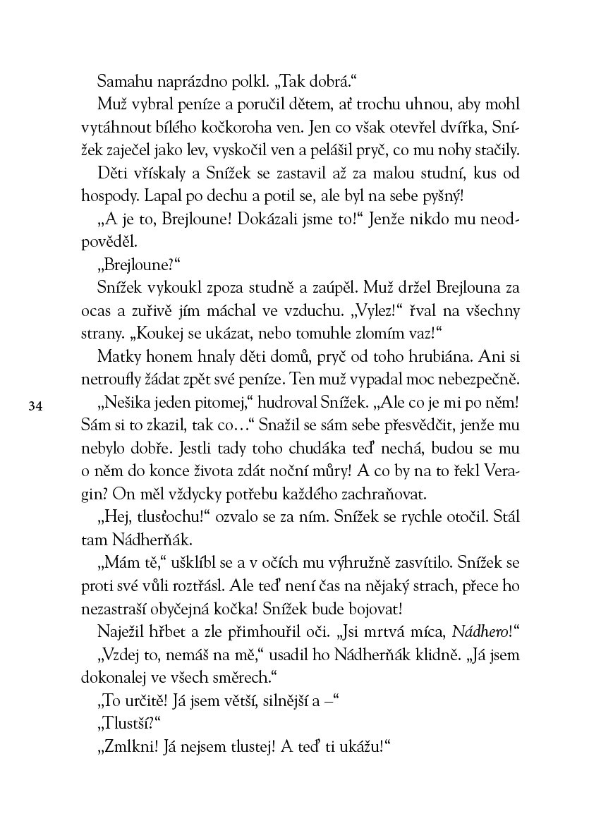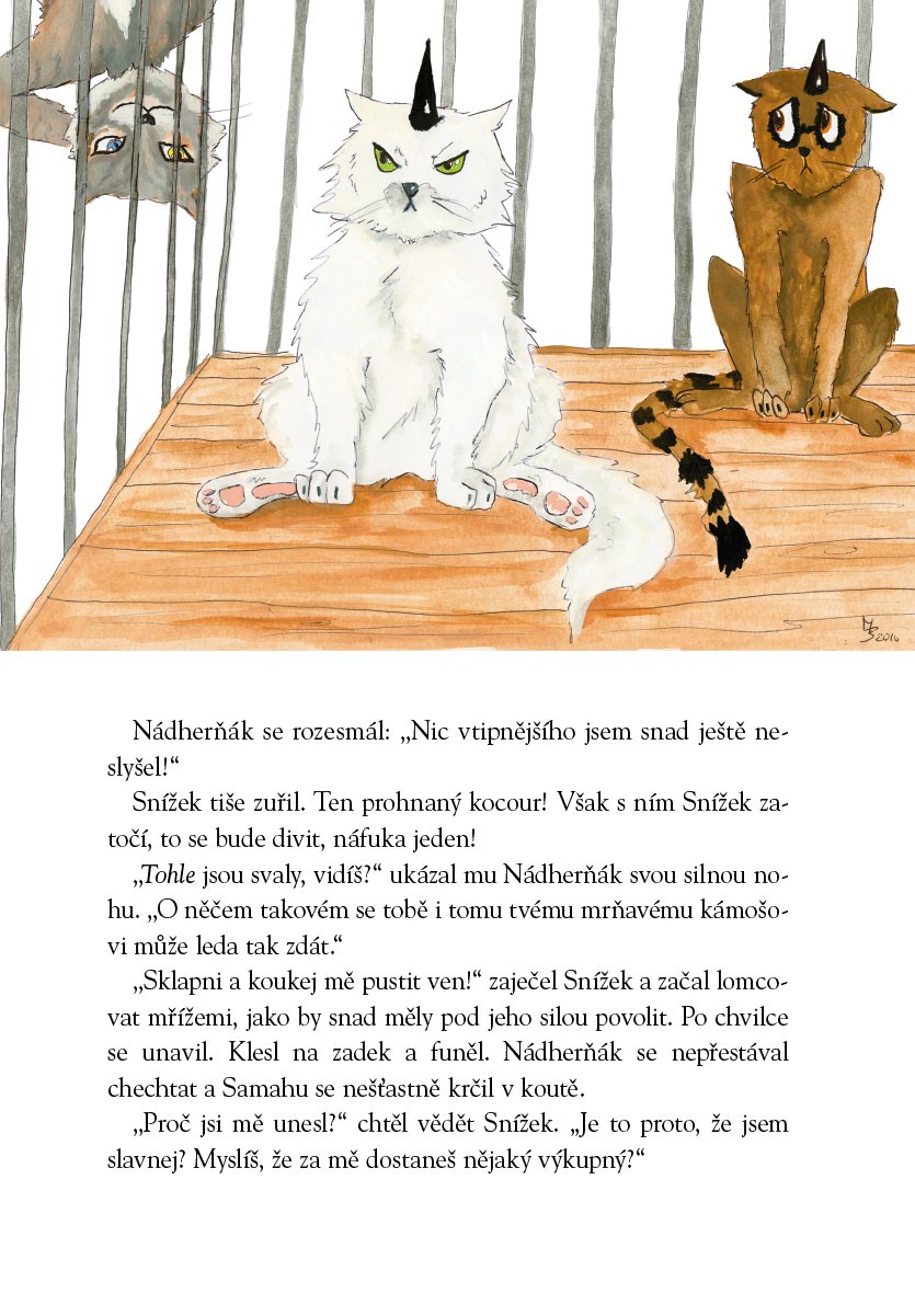 Snížek je kočkoroh. Spokojeně si žije u Veragina, u kterého má zajištěn neomezený přísun jídla a spát může, kdykoli se mu zachce. Se vším je ale konec, když se nechá vlákat do pasti a probudí se zavřený v kleci. Drkotající vůz a nerudný trpaslík ho vezou neznámo kam.