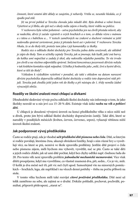 Publikace se věnuje pohybovému vývoji dítěte celkově, zejména však grafomotorice, kresbě a problematice laterality, a poskytuje doporučení pro rozvoj dovedností formou her. V dalších částech knihy se rodiče seznámí s psychickým vývojem dítěte – s vývojem myšlení, vnímání, pozornosti, paměti, učení, řeči, ale i dětské hry. Samostatná kapitola je určena problémům předškolního věku, poruchám učení a speciální péči. Knihu uzavírá kapitola o školní zralosti. Každé téma je doplněno širokou nabídkou doporučené literatury.
