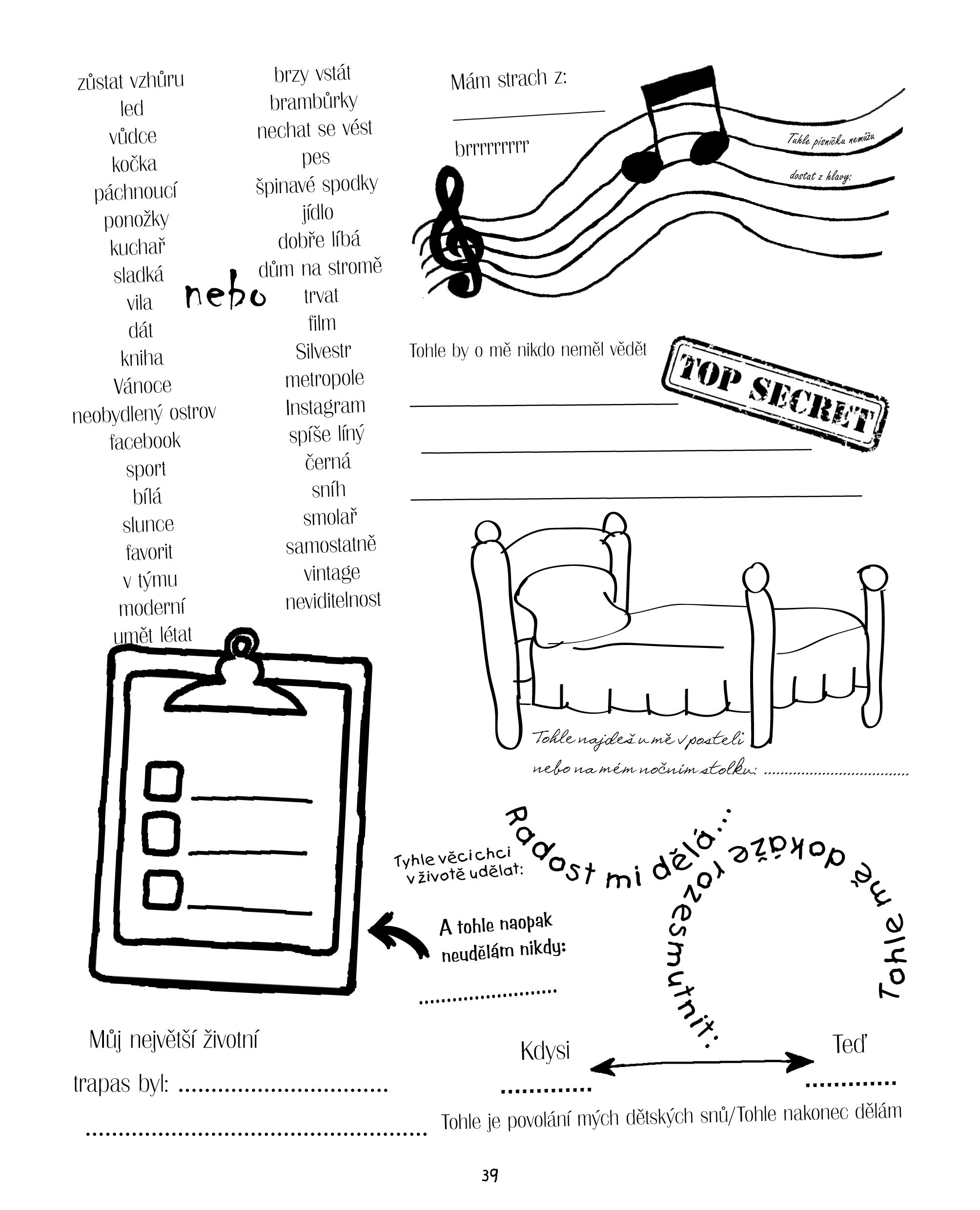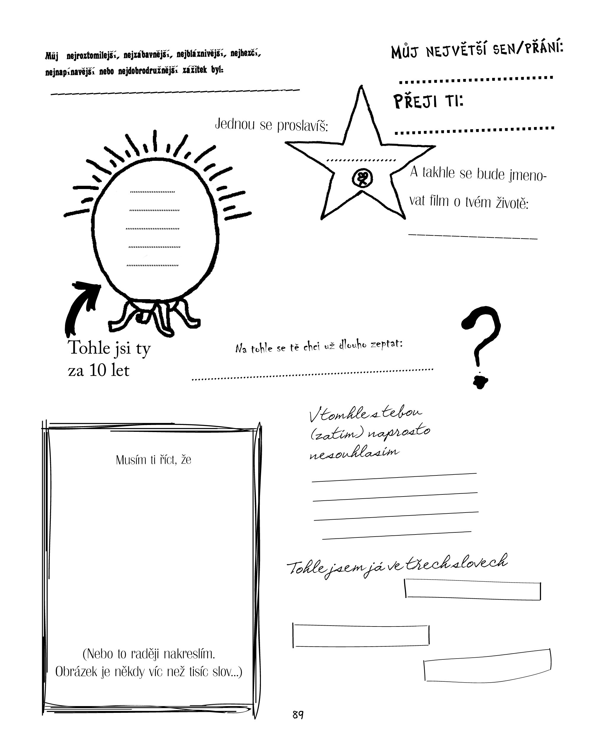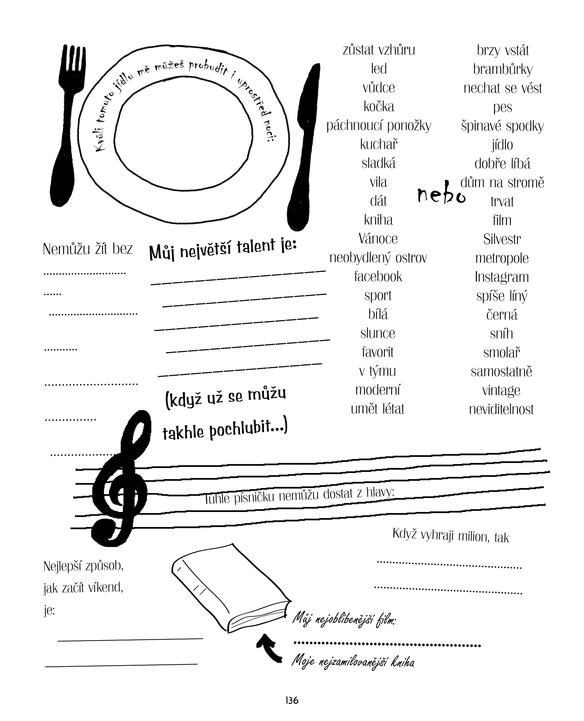 Co mají tví kámoši pod postelí? Jakou by ti dali přezdívku? Koho tajně milují? A co si o tobě mysleli, když tě poprvé viděli? To vše se můžeš dozvědět velmi jednoduše. Popros je, aby vyplnili prázdné stránky v této knížce.