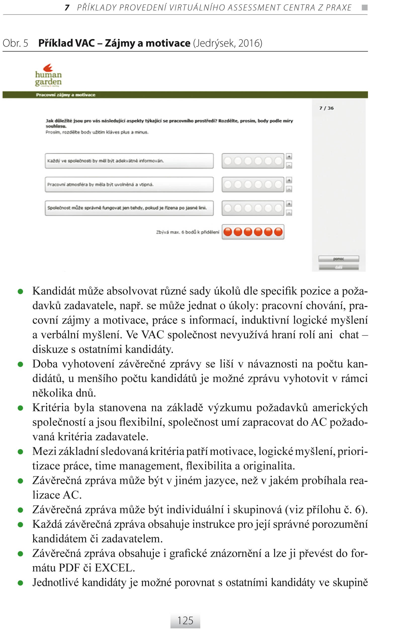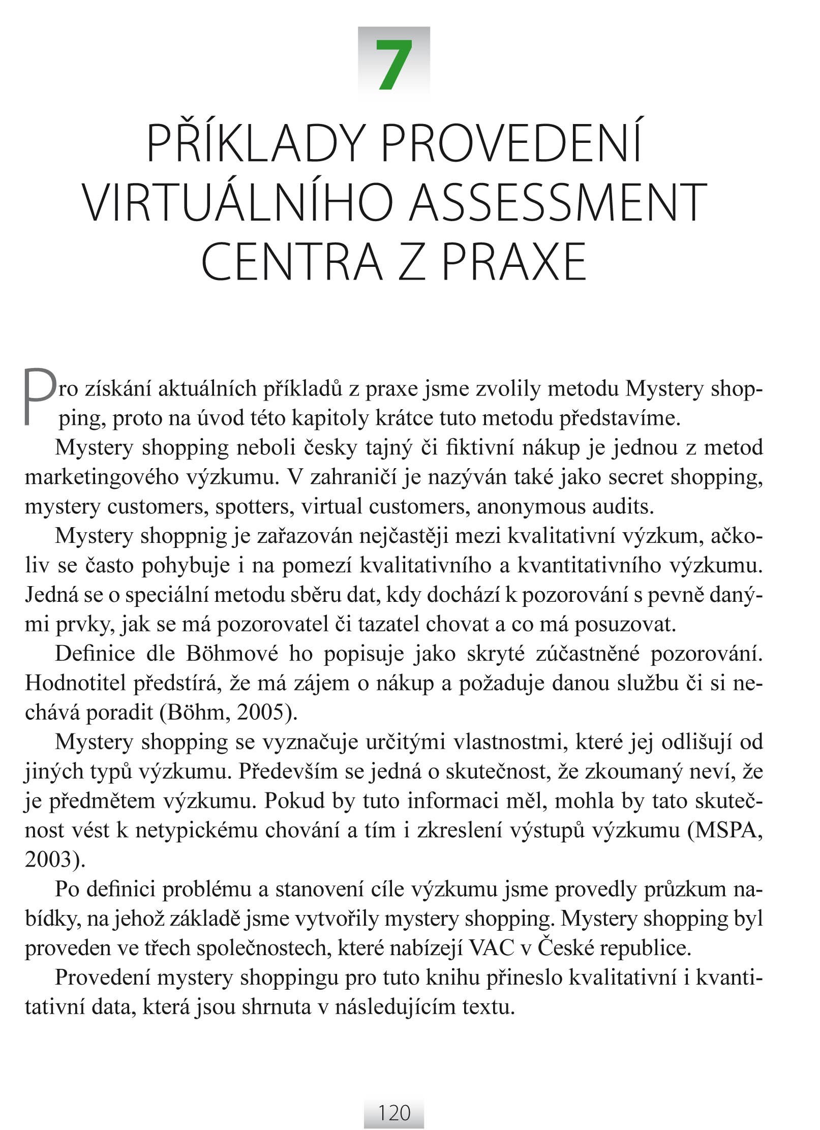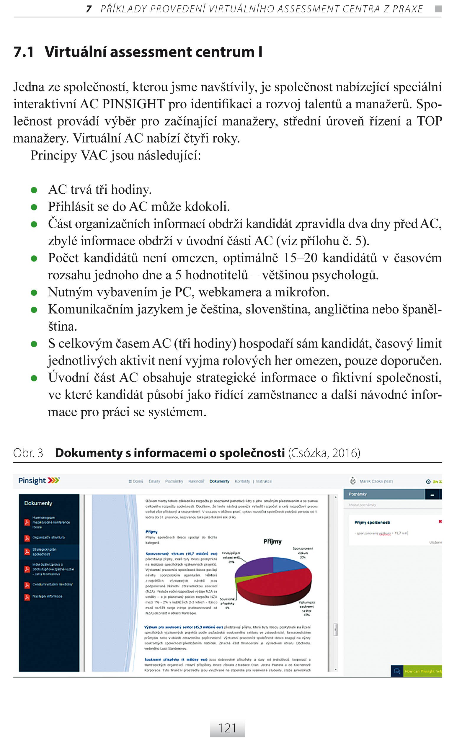 Monografie Assessment centrum. Moderní nástroje výběru zaměstnanců věnuje pozornost aktuálnímu trendu v oblasti diagnostických metod používaných v personalistice, a to především využití virtuálního assessment centra, s nímž se na trhu práce v poslední době stále častěji setkáváme. Assessment centrum je systematický výběrový nástroj, který hodnotí aktuální schopnosti jedince a stanoví jeho budoucí profesionální rozvoj. Jinými slovy, je to metoda založená na pozorování účastníků výběrového řízení v navozených modelových situacích a následném porovnání jejich znalostí, schopností a dovedností s požadavky na výkon konkrétní pracovní pozice, převážně pozice ve vrcholovém managementu. Tato - velmi propracovaná - metoda umožňuje hodnotitelům již během výběrového řízení detailně prověřit konkrétní schopnosti a dovednosti kandidáta, identifikovat jeho silné a slabé stránky, reakce na krizové situace a způsoby jeho chování, a vnést tak objektivitu do rozhodování o obsazení příslušných pozic a následném řízení zaměstnanců. Umožňuje zkrátka vybrat přesně takové zaměstnance, jaké organizace potřebuje. V případě virtuálního assessment centra – které má podobnou strukturu jako klasické assessment centrum - řeší jedinec v rámci diagnostiky příslušné úkoly v elektronickém prostředí a od klasického se liší tím, že umožňuje preciznější měřitelnost sledovaných parametrů.