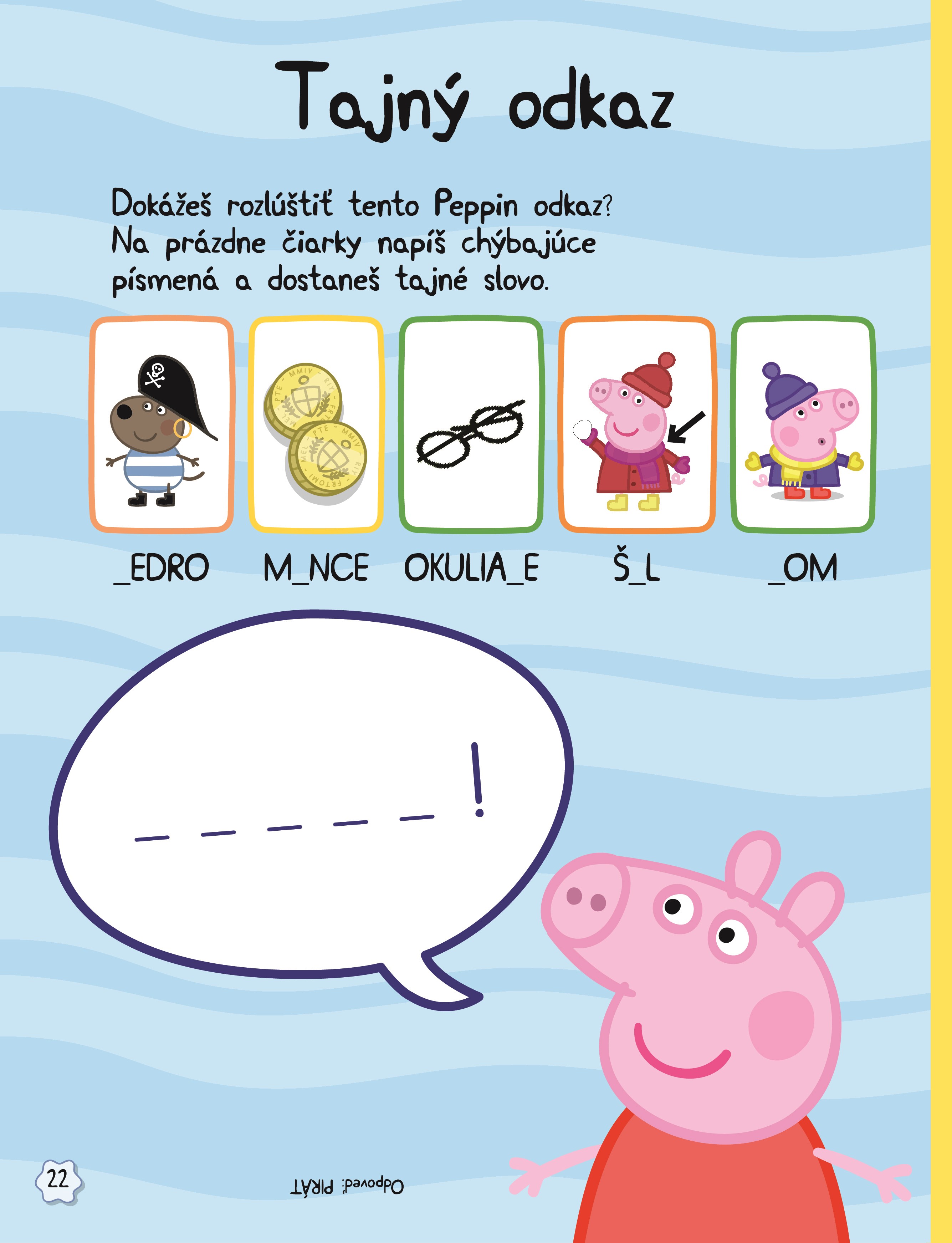 Prasiatko Peppa prichádza s ďalšou knihou príbehov a zábavy. Dozviete sa, ako Peppa s kamarátmi hľadali pirátsky poklad, čo sa stalo pri záchrane nezbednej korytnačky, a o čom bola rozprávka na dobrú noc pre bračeka Toma. Ale to nie je všetko! Zoznámite sa s Peppinou rodinou, vyriešite hádanky a kvízy, naučíte sa cirkusové triky, zahráte sa hru a dokonca si vyrobíte vlastnú dinosauriu záložku. Prajeme príjemnú zábavu!