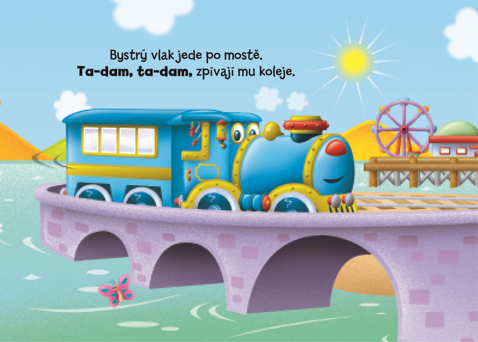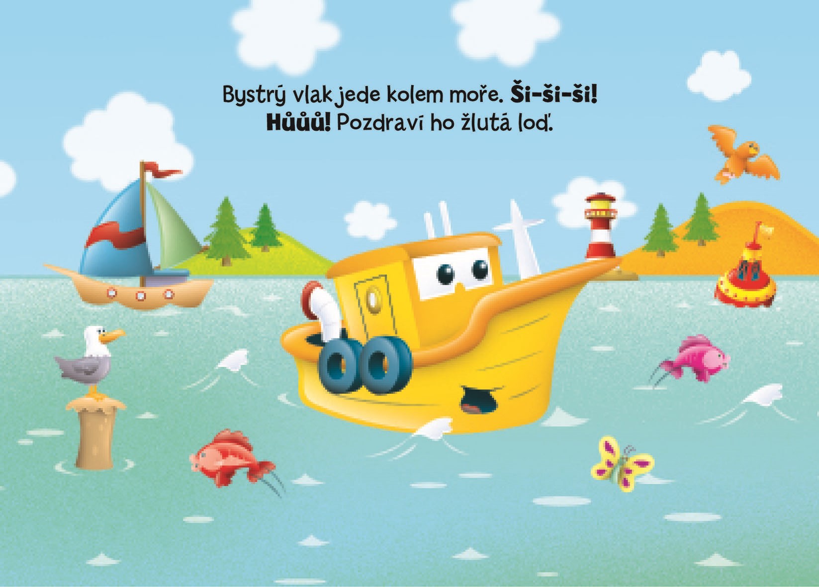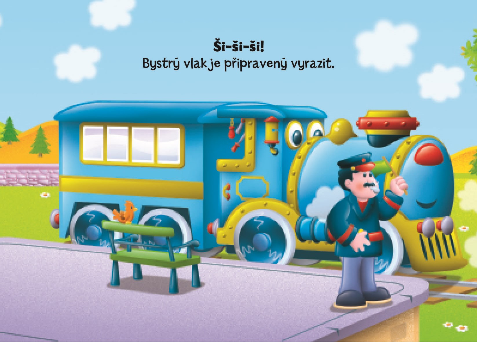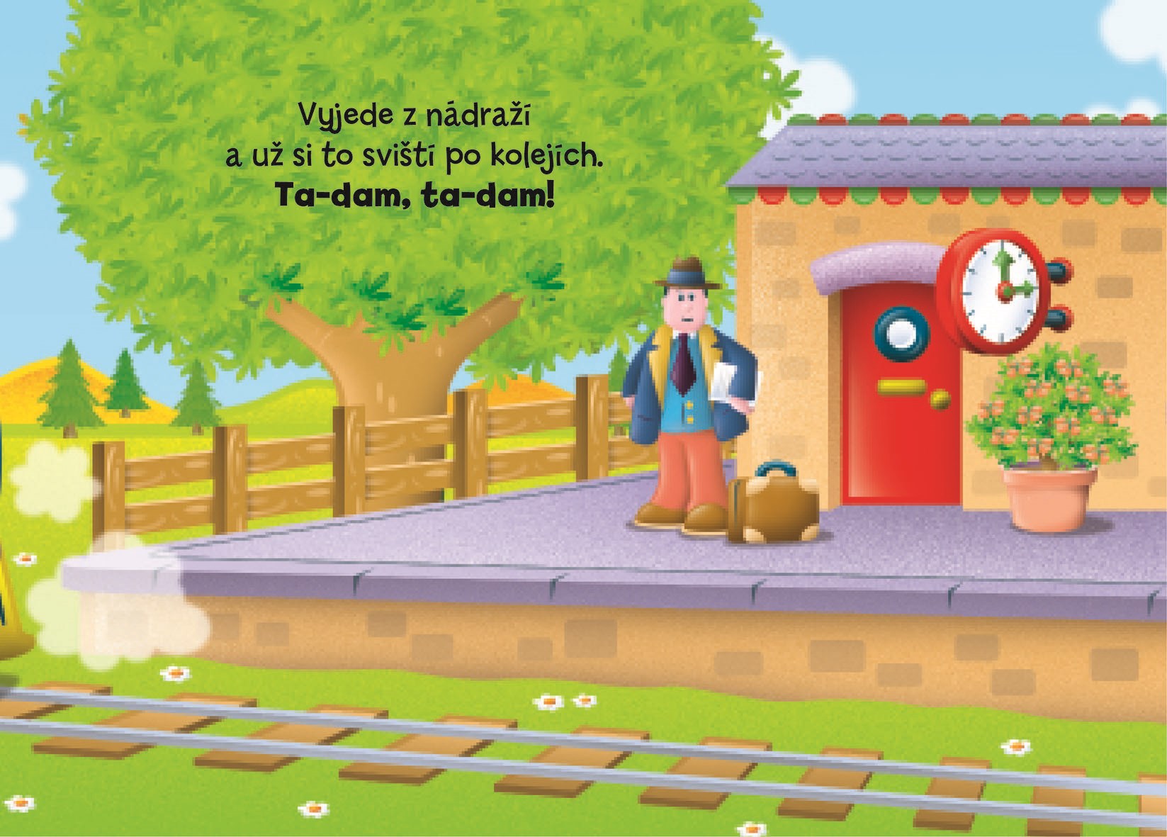 Bystrý vlak čeká na kolejích náročný den. Už od rána sviští po trati, přes mosty, kolem moře a polí až do kopců. Přečtěte si, kudy projíždí, a říkejte, co vidíte na obrázcích.