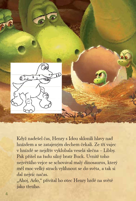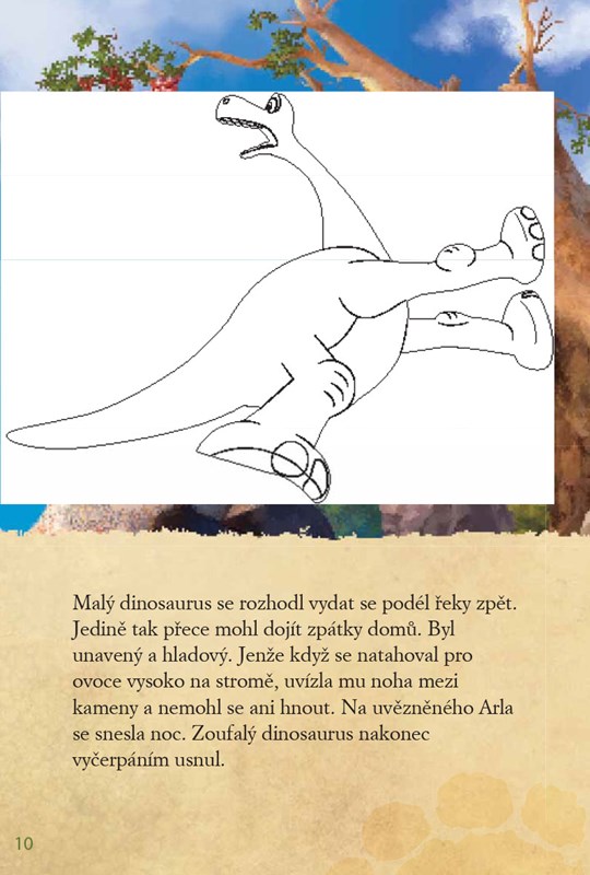 Přečti si dobrodružný příběh o cestě nemotorného dinosaura Arla a jeho lidského kamaráda Spota světem nebezpečných nástrah, vybarvi známé postavičky a nalep samolepky oblíbených hrdinů!