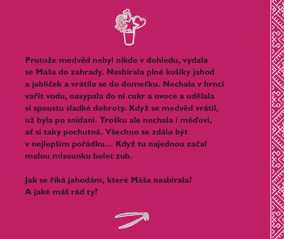 Ve zbrusu novém příběhu našich oblíbených hrdinů má Máša ukrutný hlad. Uvaří si proto sladké jahody… jenže i začne bolet zub. Podaří se ho medvědovi vytrhnout? Nebo snad pomůžou vlci? A co bychom měli dělat, aby nás zuby nebolely? Zjistíte to v knížce s barevnými dílky puzzle, které můžete znovu poskládat!