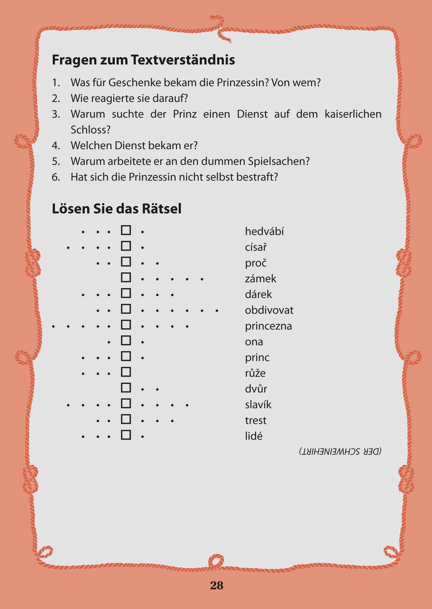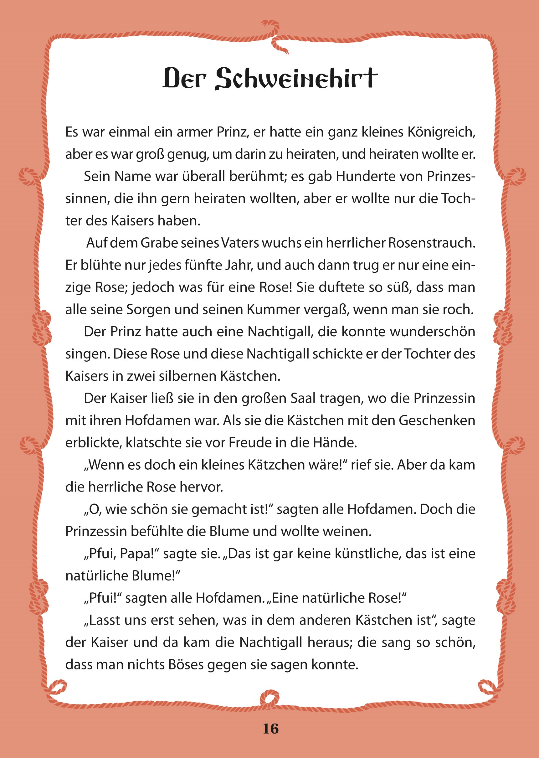 Prostřednictvím dvojjazyčného vydání pěti vybraných příběhů si čtenáři mohou vyzkoušet, jak si poradí se souvislým německým textem. Úroveň jazyka v publikaci je vhodná pro začínající studenty němčiny. Český zrcadlový překlad umožní zájemci obratem zkontrolovat, zda cizojazyčnému textu správně porozuměl. Za každou pohádkou následuje dvojstránka s otázkami, úkoly a hádankami.