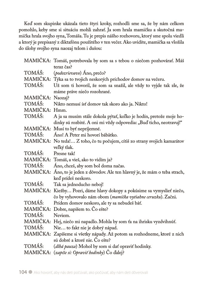 Svetový bestseller! Vynikajúca pomôcka pre komunikáciu rodičov s deťmi vychádzajúca z praxe skúsených autoriek – detských psychologičiek. Názov knihy doslova zodpovedá tomu, čo v knihe nájdete. Poskytuje návody krok za krokom na zlepšenie a posilnenie vzájomných vzťahov v rodine a porozumenia medzi rodičmi a deťmi. Vhodnou pomôckou sú kreslené ukážkové situácie s odporučeným priebehom dialógu.