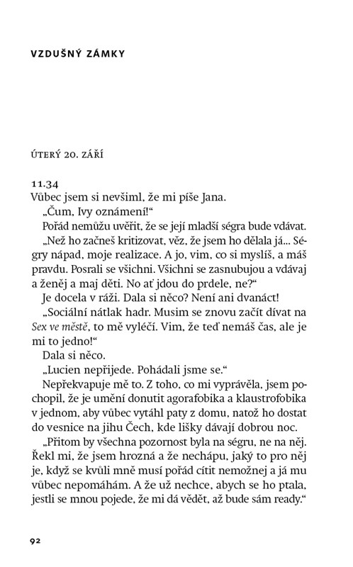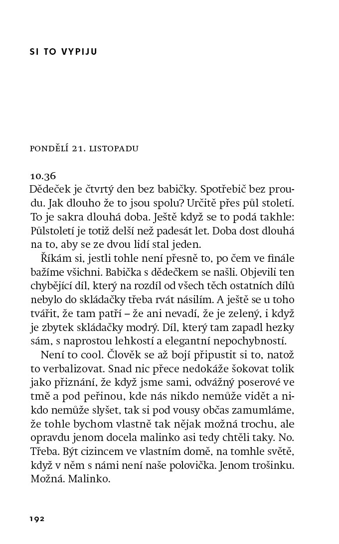 Sedmadvacetiletý (už?!) Martin se snaží. Fakt. Na své blízké si vždy udělá čas, byť na úkor jiných blízkých; články do časopisu, kde pracuje, odevzdává s předstihem, třebaže jsou na hony vzdálené zadání; část výplaty posílá na spořicí účet, aby ji pak před výplatou zase vybral; dobře jí, venku, protože sám uvaří sotva čaj; má členství v posilovně a (evidentně) umí věci podat tak, že vypadají lépe, než jaké ve skutečnosti jsou. To poslední ho naučil Instagram. Je sám. Protože má fóbii ze seznamek a nevypadá zrovna jako Andrés Sanjuan (stojí za to vygooglovat), asi sám i zůstane. Když nad sebou tak přemýšlí, je buď nejlepší, nebo nejhorší člověk na světě. Nemůže se rozhodnout. Najisto ví jediné: Dělá si to sám. A píše si o tom deník.