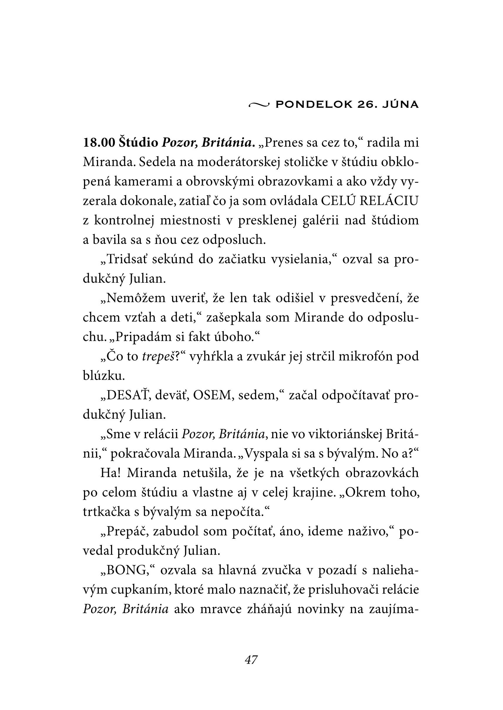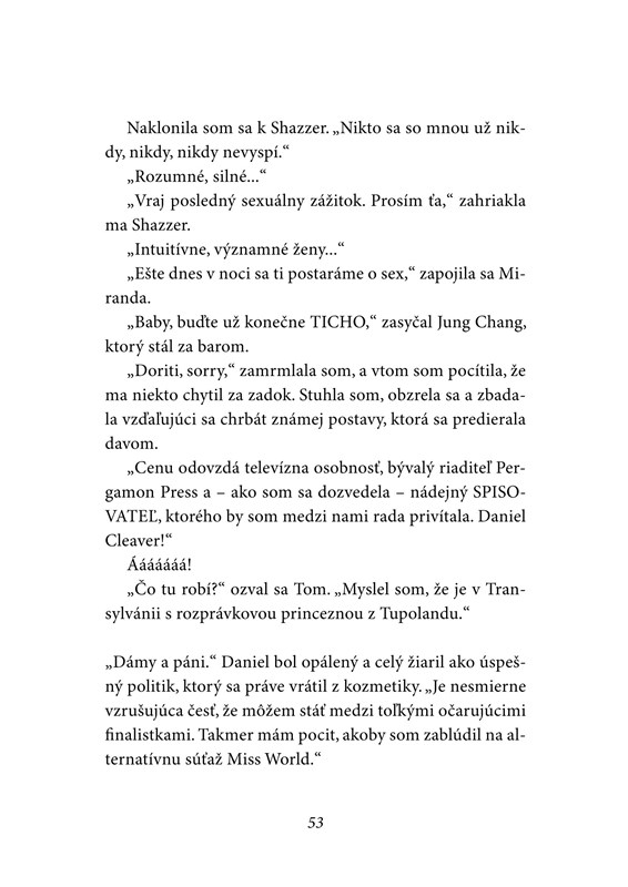 „Viezli sme sa po uliciach k nonstop otvorenej lekárni a ja som mala pocit, akoby som sa viezla po cintoríne mojich plodných rokov. Tamto je strom, na ktorý mi Daniel Cleaver vyhodil nohavičky po vianočnom večierku Pergamon Press, tamto zase roh ulice, kde sme sa s Markom prvýkrát bozkávali v snehu, tamto prah dverí, kde mi Mark Darcy prvýkrát povedal: ,Mám ťa rád takú, aká si.´“