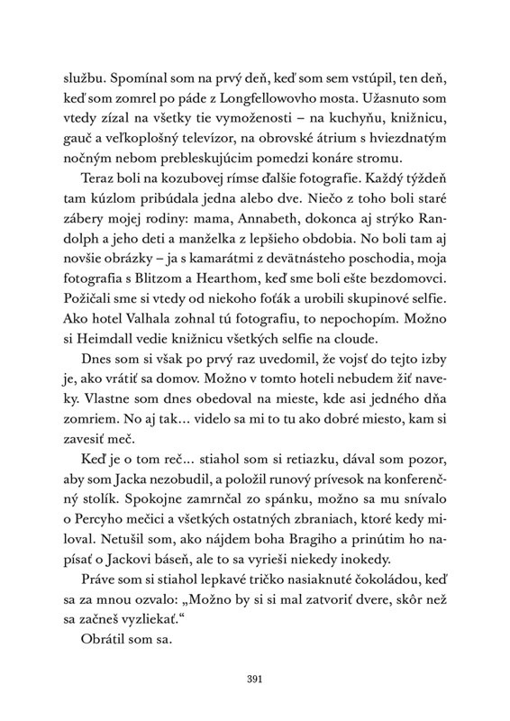 Čo sa týka ostatných postáv... už som spomínala, že k vedľajším postavám som si nevytvorila až taký hlboký vzťah, hlavne čo sa týka Magnusových kamarátov a spolubojovníkov z Hotela Valhalla. Myslím, že to bolo čiastočne aj tým, že nemali v knihách až tak veľký priestor, takže som o nich nič nevedela a prišlo mi ťažko sa do nich vcítiť. To sa v tejto knihe však našťastie zmenilo a dozvedeli sme sa trochu viac o ich minulosti. Toto na Riordanových postavách zbožňujem, že sú naozaj prepracované, každá má svoju (väčšinou zložitú) minulosť a od toho sa odvíjajú aj ich vlastnosti. Gunderson je prchký a krvilačný, pretože sa narodil pred vyše 1200 rokmi v Nórsku za čias vikingov a už v 12. rokoch podstúpil pravý vikingský výcvik. Celý život bojoval a po smrti v tom vo Valhalle pokračoval, keďže to je vlastne jediné, čo einherjari po smrti robia.