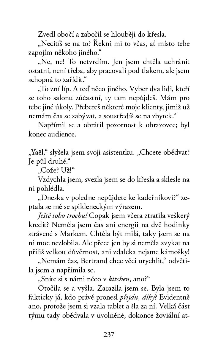Díky úzké spolupráci se šéfem jsem se těšila úctě svých kolegů a také se mě obávali, což mi dokonale vyhovovalo. Zbožňovala jsem, když jsem dorazila na nějakou ekonomickou konferenci, kam jsem doprovázela klienta, a slyšela, jak si o mně šeptají, když jsem šla kolem nich; ano, záviděli mi, obávali se mě, dvořili se mi. Byla jsem v agentuře nejdéle. Marně jsem se snažila pochopit jejich důvody, proč opouštějí naši loď, doslova mě omračovalo pomyšlení, že dávají přednost volnému času, klukům a bůhvíčemu ještě před profesionálním životem. Jak můžou opustit takovýhle džob!