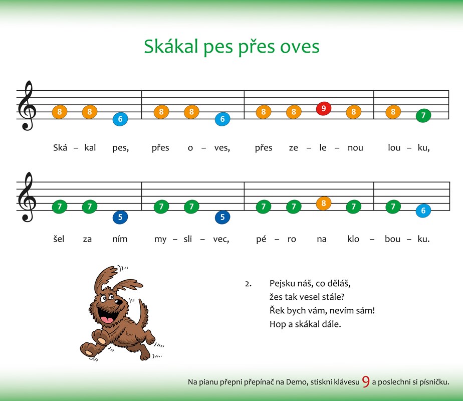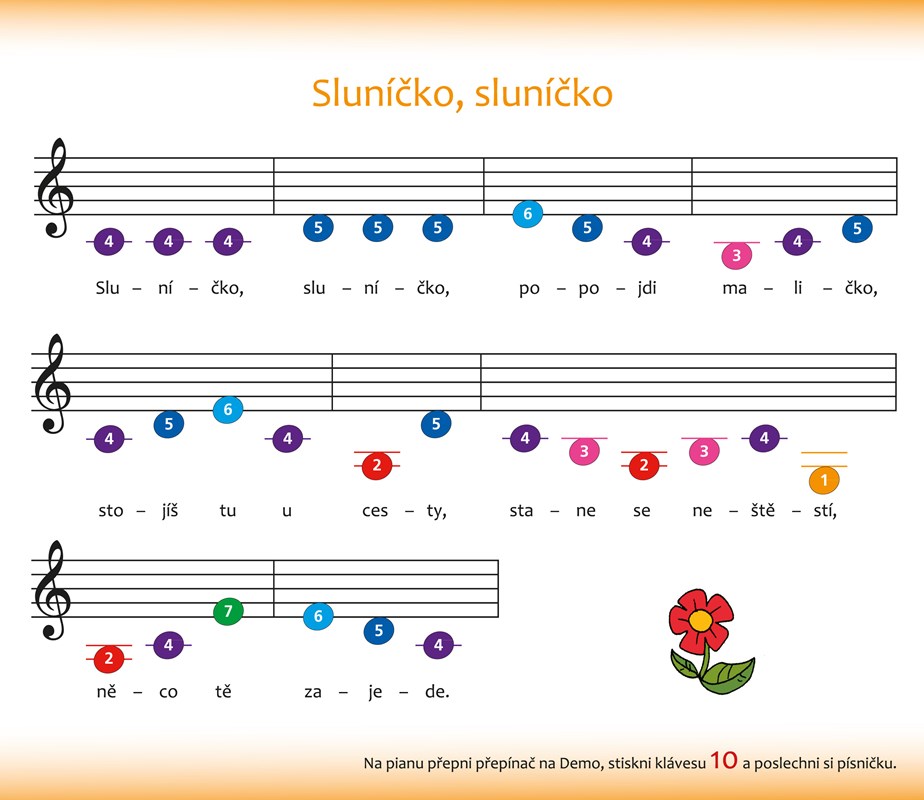 Barevné noty s čísly nahrazují v této knížce tradiční notový záznam. Pro děti je tento záznam srozumitelnější a umožňuje jim, zahrát si na pianko samostatně bez pomoci rodičů.