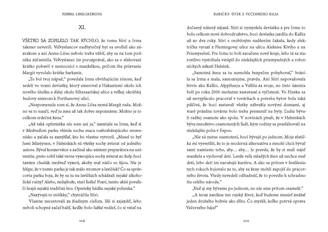 Kniha Babičky: Útek z večerného hája od fínskej autorky a novinárky Minny Lindgrenovej je druhým dielom obľúbenej fínskej trilógie, v ktorom nás autorka opäť vtiahne do nevšedného života troch akčných babičiek. Už prvý diel, ktorý vyšiel pod názvom Babičky: Smrť vo večernom háji, sľuboval aj detektívnu zápletku, ktorá mala dej ešte viac osviežiť.