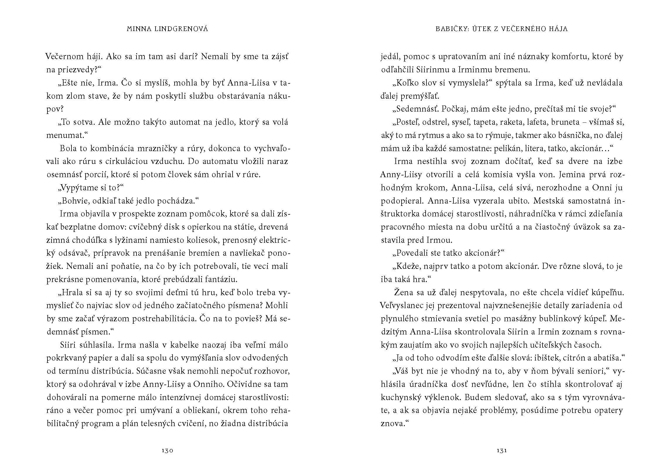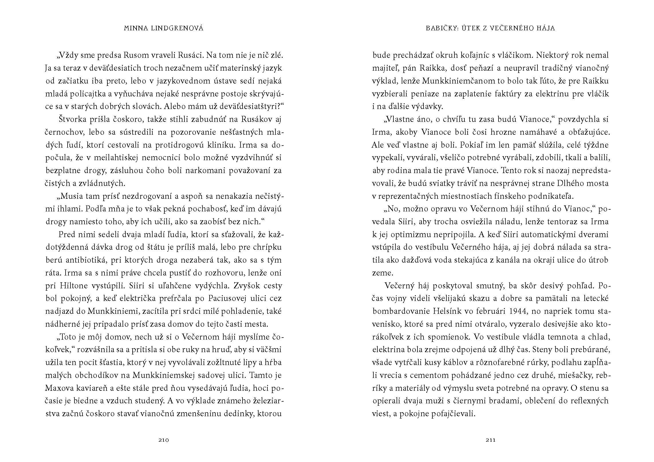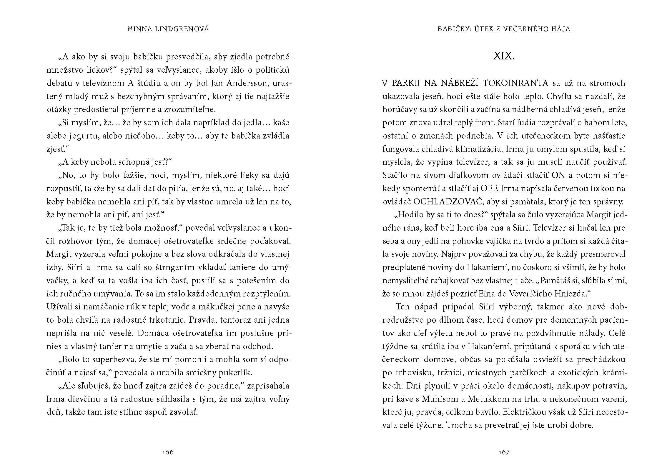 „Nedôverčivo sa na dvere zahľadela, akoby mohla pochopiť, o čo ide, ak sa na ne bude pozerať naozaj prísne. Zrejme tam bol ktosi s kladivom v ruke a chcel dnu. Siiri zhľadúvala kabelku. Nebola na stolíku s telefónom ani na posteli alebo nočnom stolíku, odrazu sa však prekvapivo objavila na ratanovej stoličke v predsieni, kde aj mala byť. Zavesila si kabelku na predlaktie, akoby ju mala chrániť pred každým zlom, a opatrne pootvorila dvere.“
