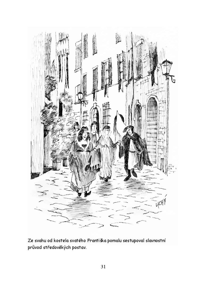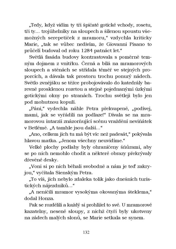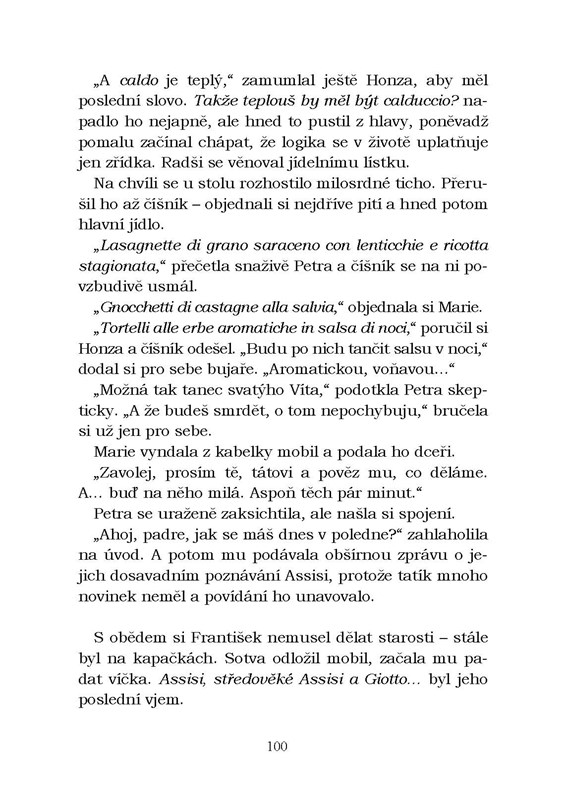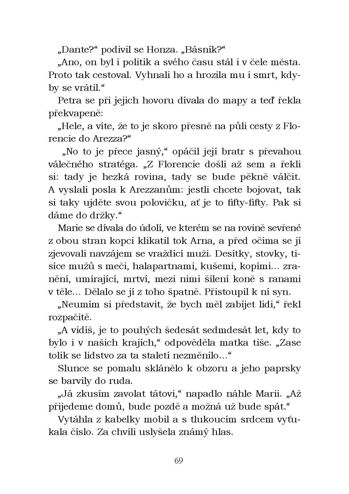 Plány jedné české rodiny na dovolenou v Toskánsku se obrátí vzhůru nohama v okamžiku, kdy otec vytáhne z hořícího auta italského hraběte a ocitne se v nemocnici. Režie cest zbytku Čechů se ujme mladý syn hraběte, který jim pomáhá poznat krásy svého rodného kraje a přitom postupně zdolává i počáteční odpor české dívky k němu samému. Návštěvy památek se prolínají s horečnatými vizemi otce, které čtenáře vtáhnou do dějů dávno minulých. Knížka vhodná pro všechny cestovatele, kteří se do Toskánska chystají, i pro ty, kteří ho již poznali.