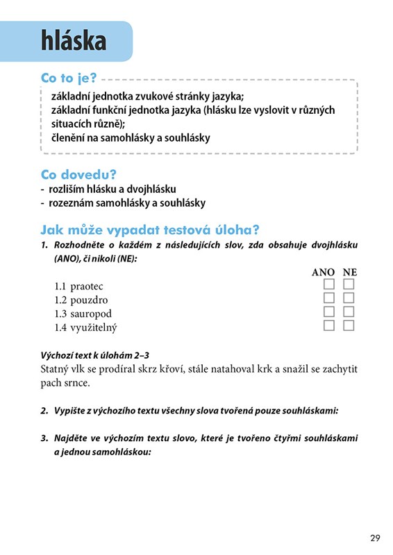 Každému heslu je věnována jedna stránka. Vše je jednoduše vysvětleno a doplněno informacemi o tom, jakým způsobem se na daný pojem mohou ve škole ptát. Nechybí kontrolní úlohy, na kterých si děti otestují, jestli už všemu rozumí.