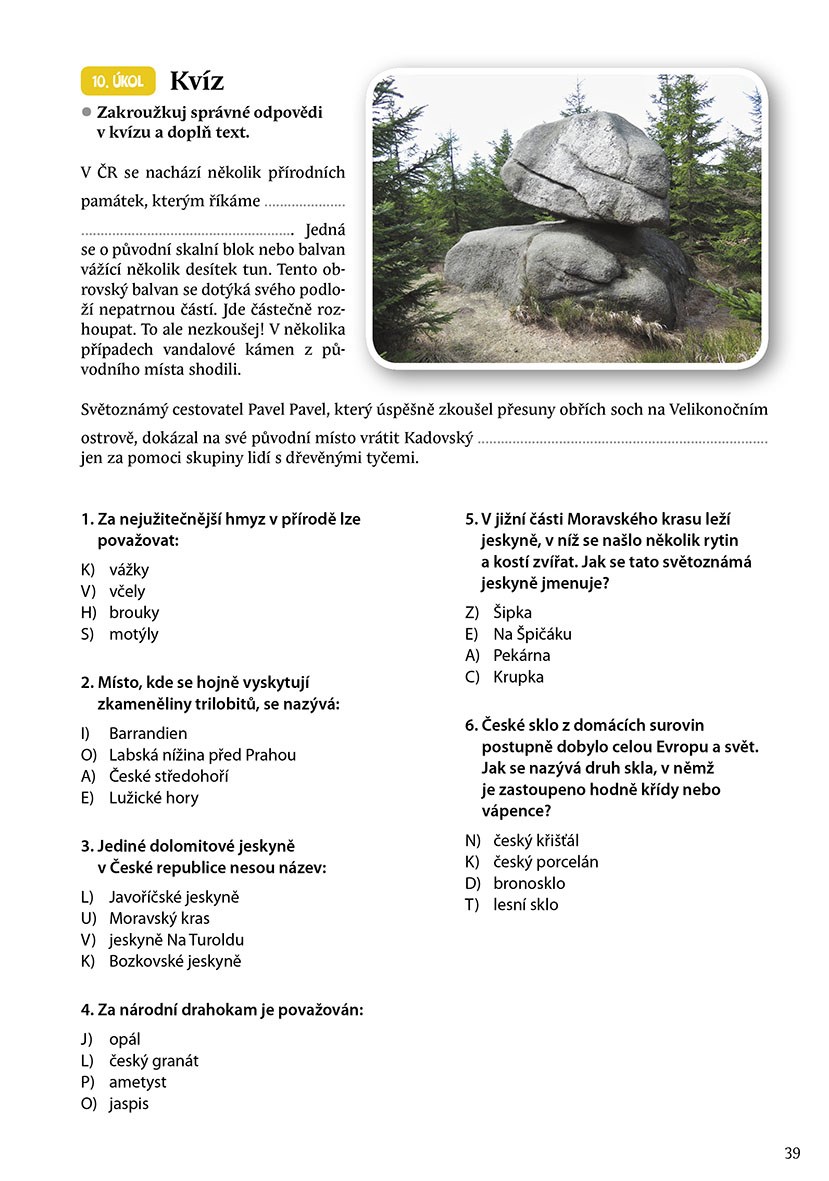 Učivo probírané ve škole je dobré procvičovat a upevňovat. Nejlépe zábavnou a hravou formou, která bude děti bavit. Na principu „škola hrou“ je postaven i tento pracovní sešit. Znalosti o České republice žáci získají prostřednictvím praktických cvičení. Pomocí stříhání, lepení, dokreslování či logického uvažování si rozšíří informace o významných osobnostech českého národa, kulturních a historických památkách, přírodních zajímavostech či postavení naší země v evropském kontextu.
