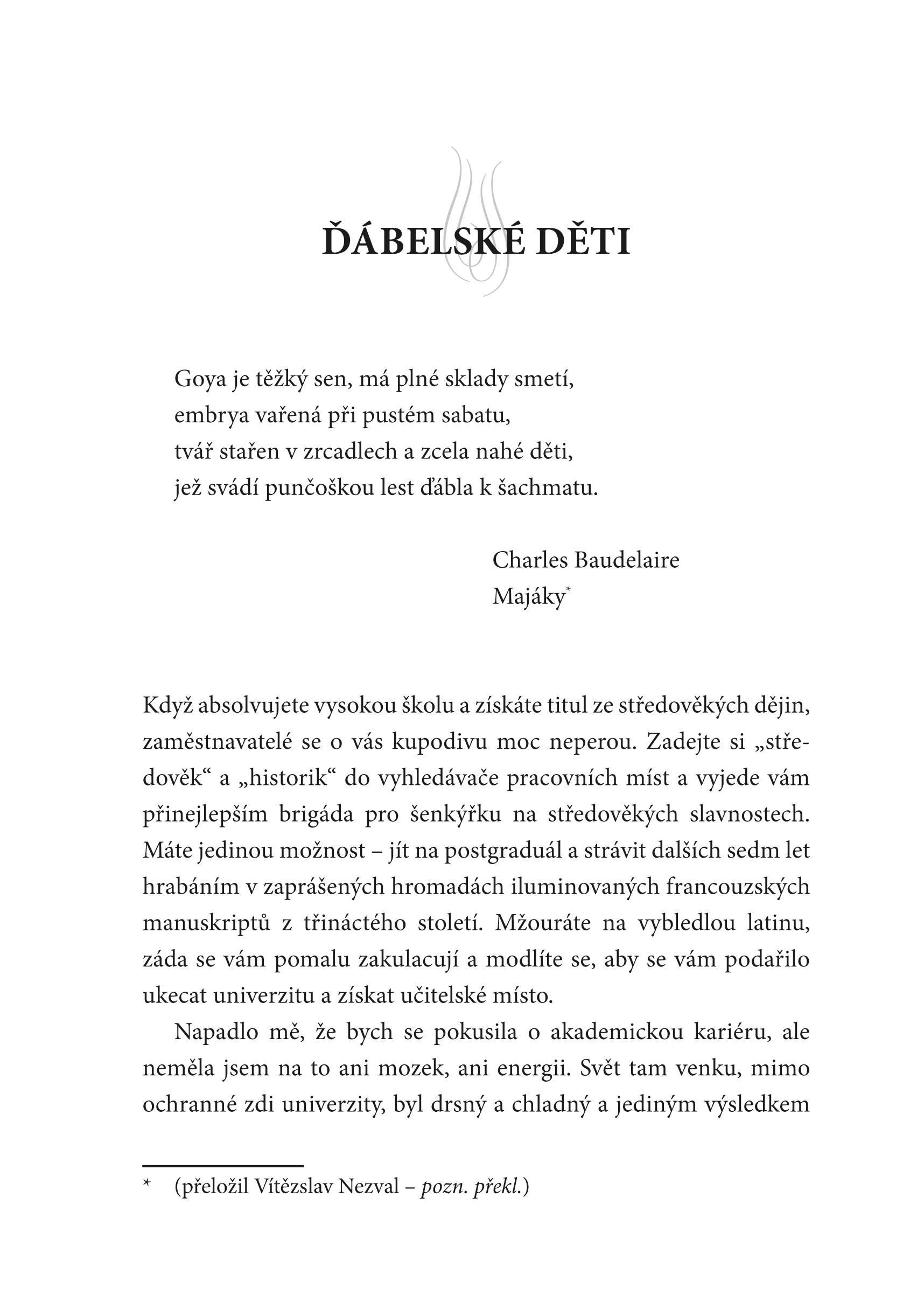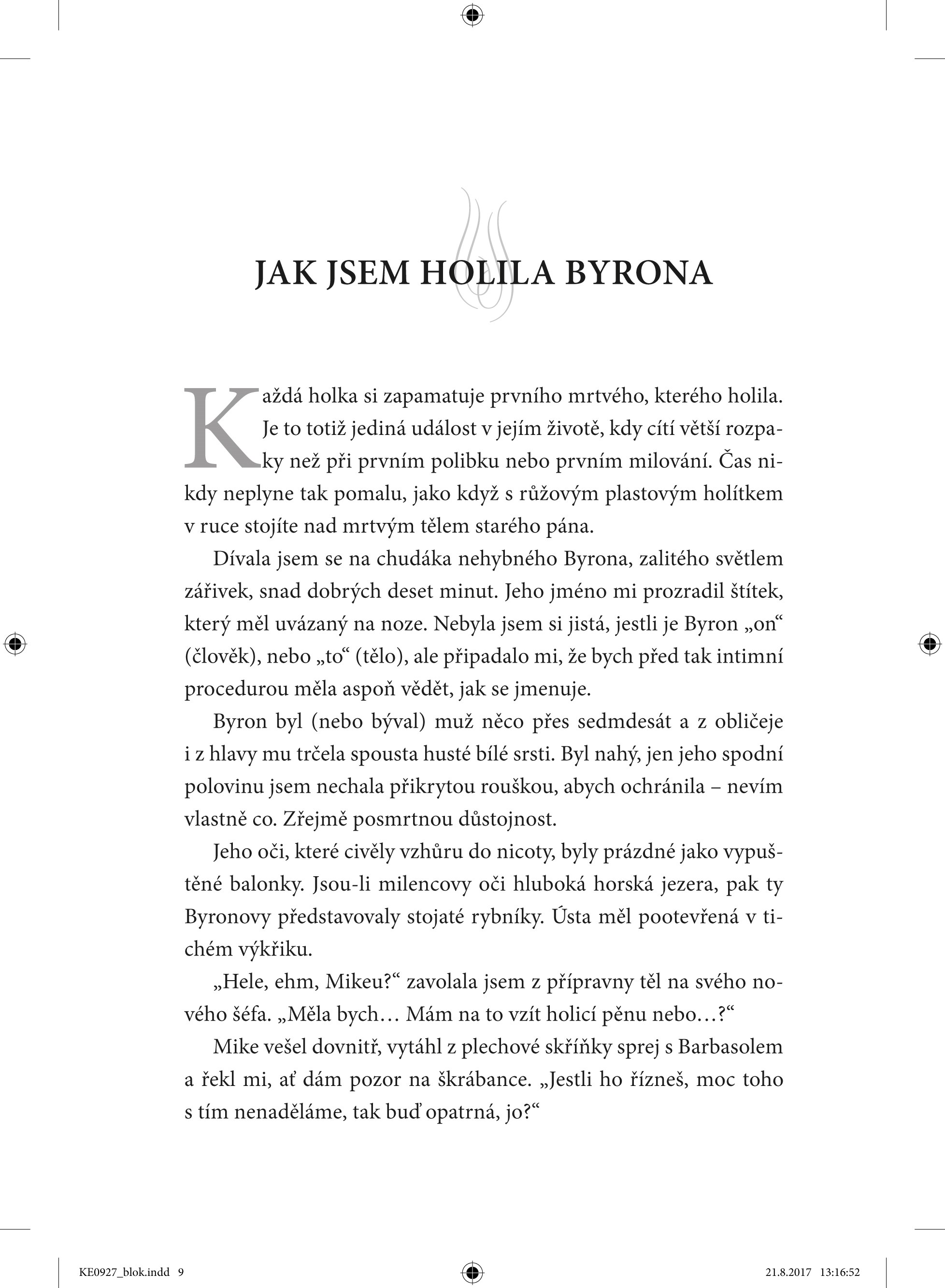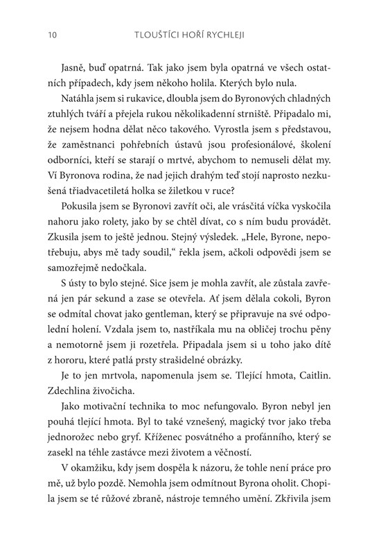 Caitlin hneď v prvej kapitole opisuje, ako holila svojho prvého mŕtveho. Má použiť holiacu penu alebo nemá? A nesmela ho porezať, pretože rodina ho ešte pred kremáciou chcela naposledy vidieť. Caitlin opisuje, že inému mŕtvemu musela ešte pred kremáciou vybrať z hrudníka kardiostimulátor. Medzi pracovníkmi krematórií sa totiž traduje, že lítiové batérie v kardiostimulátoroch v kremačnej peci explodujú. Ľudská koža je vraj prekvapujúco pevná. Alebo je tupý ten skalpel? A kedy bude obed? Bŕrr! Autorka píše: „Klamala by som, keby som tvrdila, že o práci v krematóriu som nemala určité predstavy. Čakala som, že zasuniem telo do jednej z obrích mašín, potom si vyložím nohy, a kým sa nebožtík spopolní, budem si čítať a jesť pri tom jahody.“