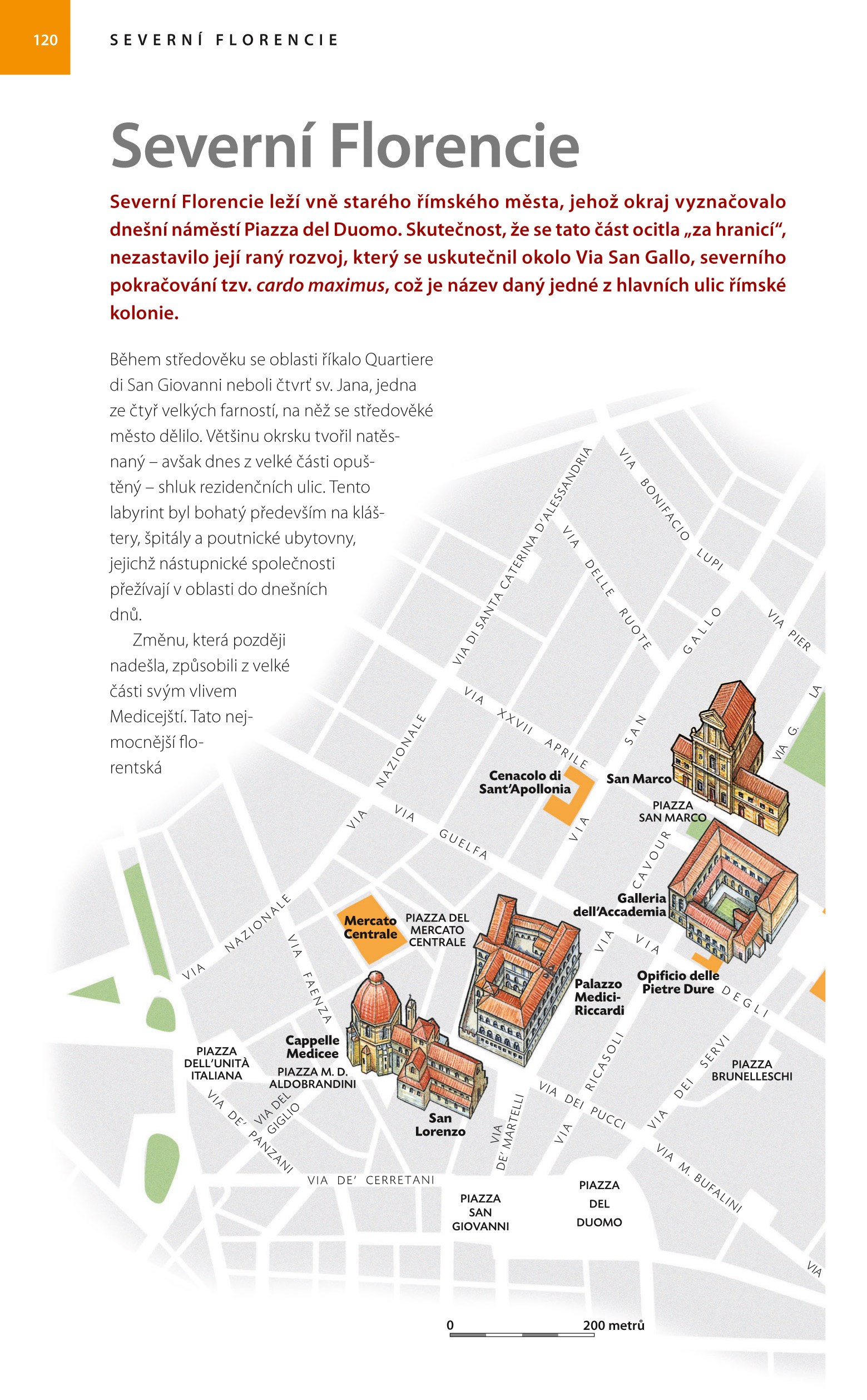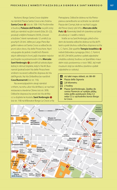 Pěší prohlídky a projížďky: doporučené trasy zakreslené na mapách a popsané v textu, jako např. procházka ze Santissima Annunziata k Santa Trínita ve Florencii nebo okolo Campo v Sieně, projížďka oblastí Chianti a Casentino.