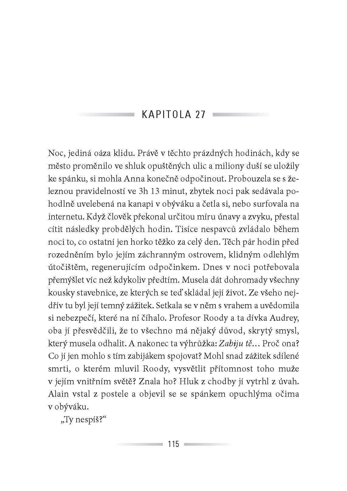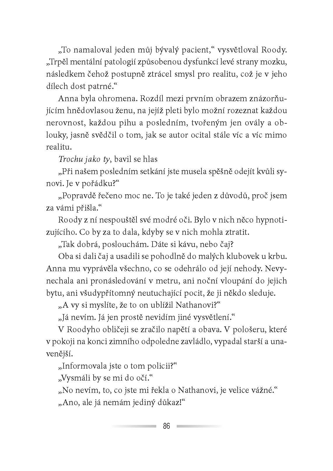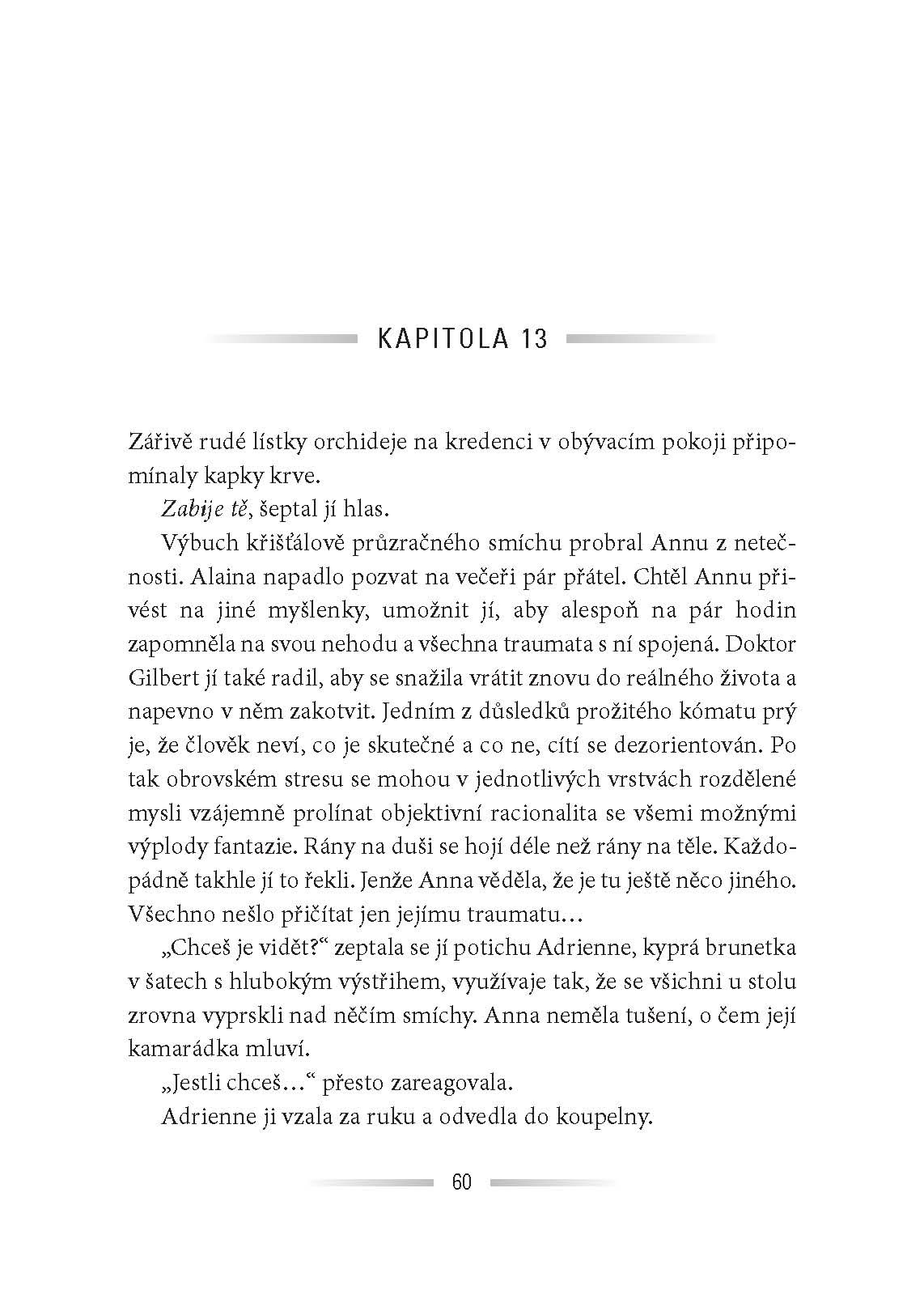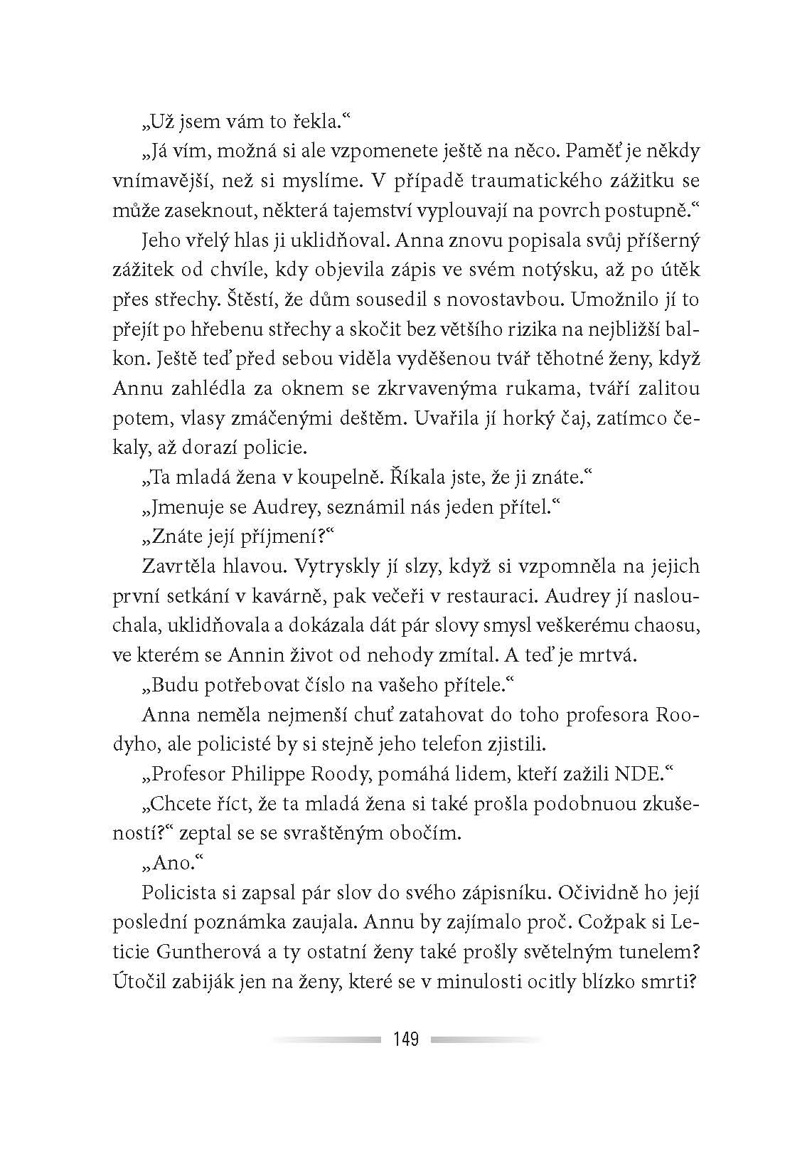 Anně se přihodil zázrak. Po nehodě a dvou týdnech v kómatu je stále naživu. Je to snad příslib nového začátku? Šance začít znovu se svým synem a manželem? Na druhou stranu se však v té kratičké chvíli, kdy její život visel na vlásku, ocitla v tunelu… Tunelu plném černého světla, kde jí nějaký muž vyhrožoval smrtí… Od té doby je jí neustále v patách. Proč si vybral zrovna ji za svědka svých zločinů? Někdy je lepší se nevracet…
