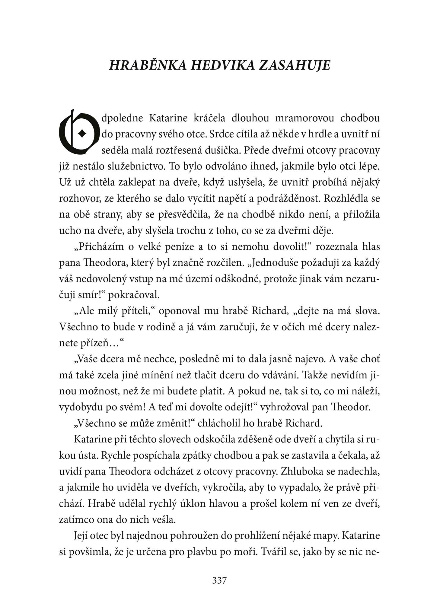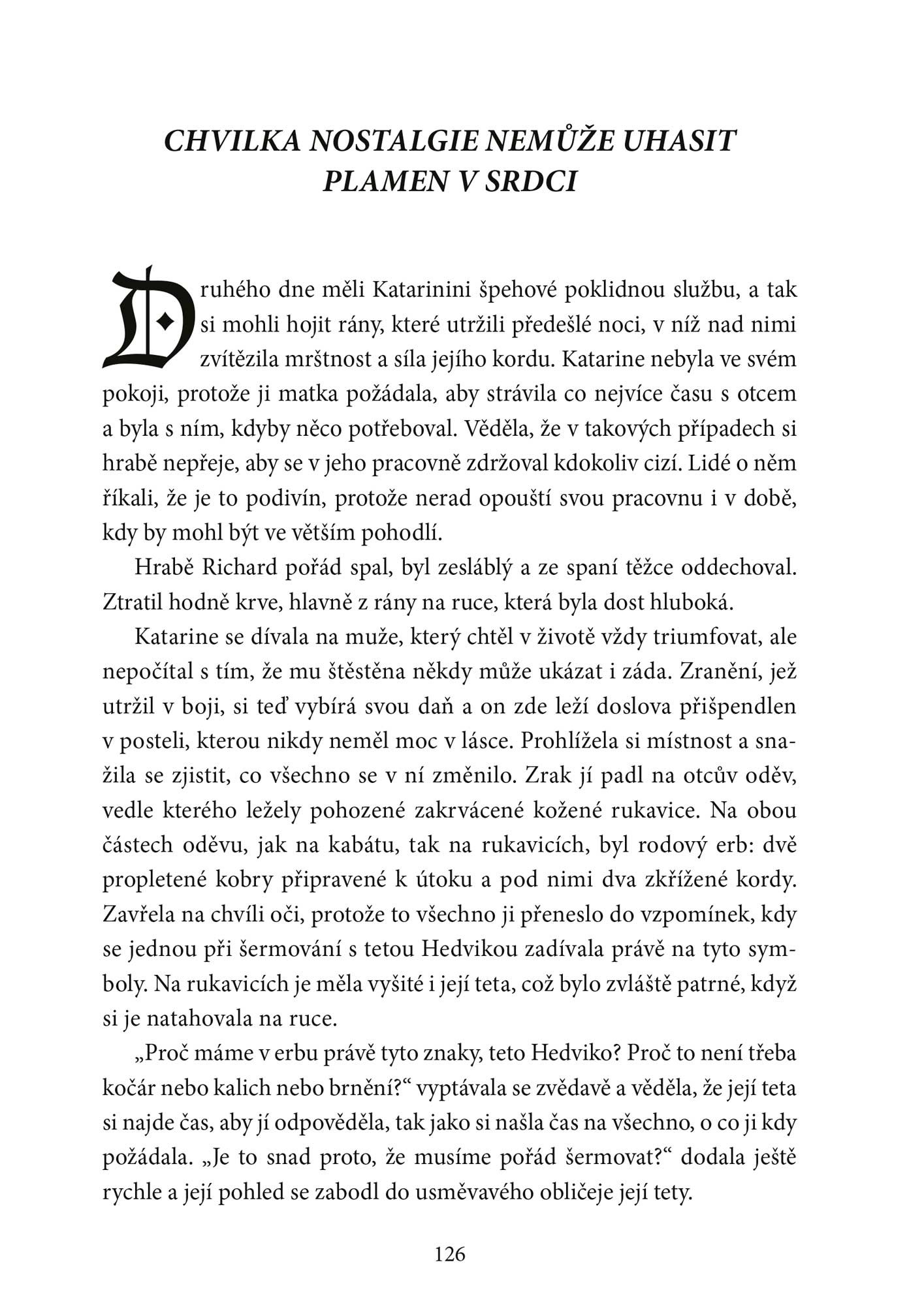 Starý a mocný je rod Wellnsburgů a půvabná Katarine je jedinou dědičkou po přeslici. Do vínku dostala nejen skvělé příjmení, ale hlavně umělecký talent, vytrvalost a dobré srdce. Jakožto jediný potomek rodu ovládá i mužské dovednosti jako šerm, jízdu na koni či navigaci. Skvělý život v rodinném sídle však pomalu bere za své, její panovačný otec se ji stále snaží ovládat a nedokáže akceptovat její osobnost. Jednoho dne, kdy už má dost otcových výbuchů hněvu i jeho nemorálních obchodů, Katarine uprchne i se svým milencem Martrekem a začne se tak odvíjet kolotoč událostí, které přinutí hlavní hrdinku intrikovat proti svému vlastnímu otci. Vybrala si tvrdého protivníka, ale Katarine není z těch, kdo se vzdávají. A navíc nebojuje jen za sebe, pod srdcem totiž nosí nový život…