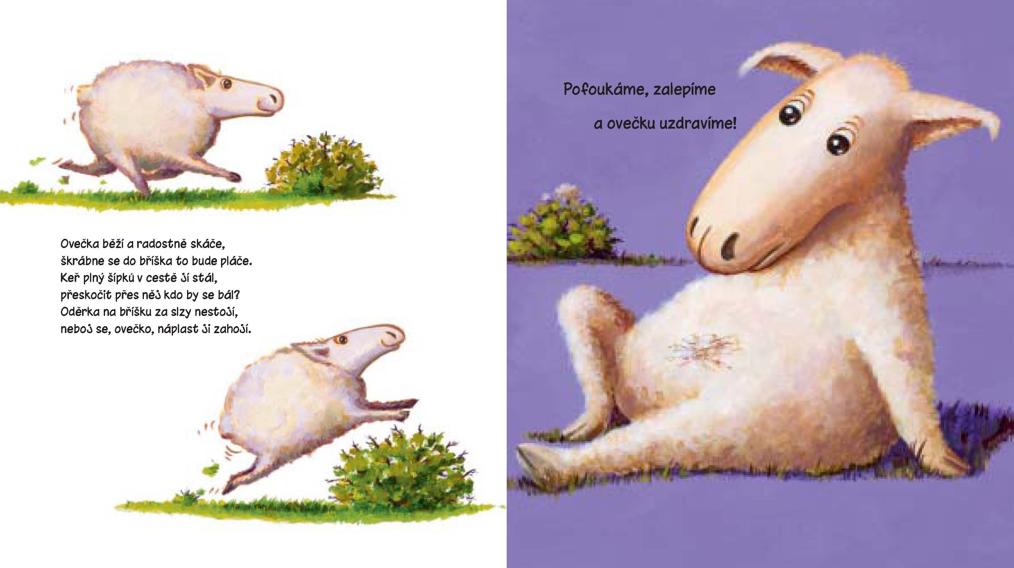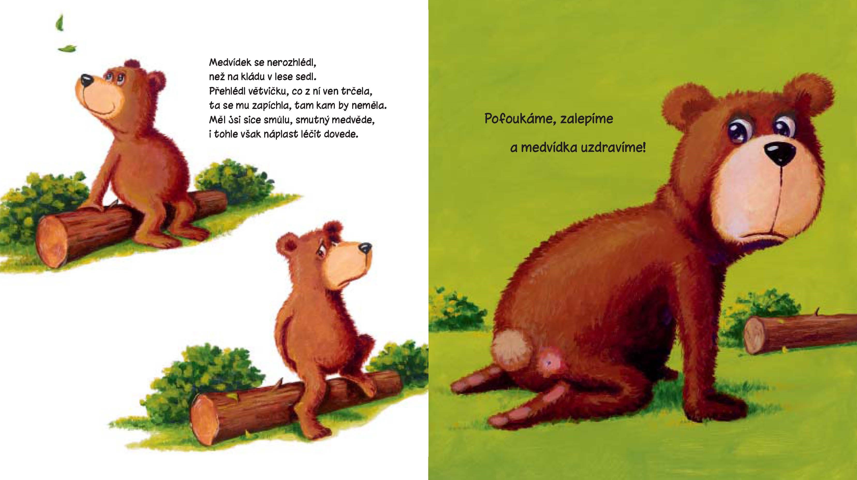 Pejsek si poranil tlapku, opička má bouli na hlavě a ovečka poškrábané bříško. Dokážeš je uzdravit? Na bolístky jim nalep náplast a rázem budou veselí. Pět barevných náplastí stačí omýt vodou a můžeš je nalepit znovu a znovu.