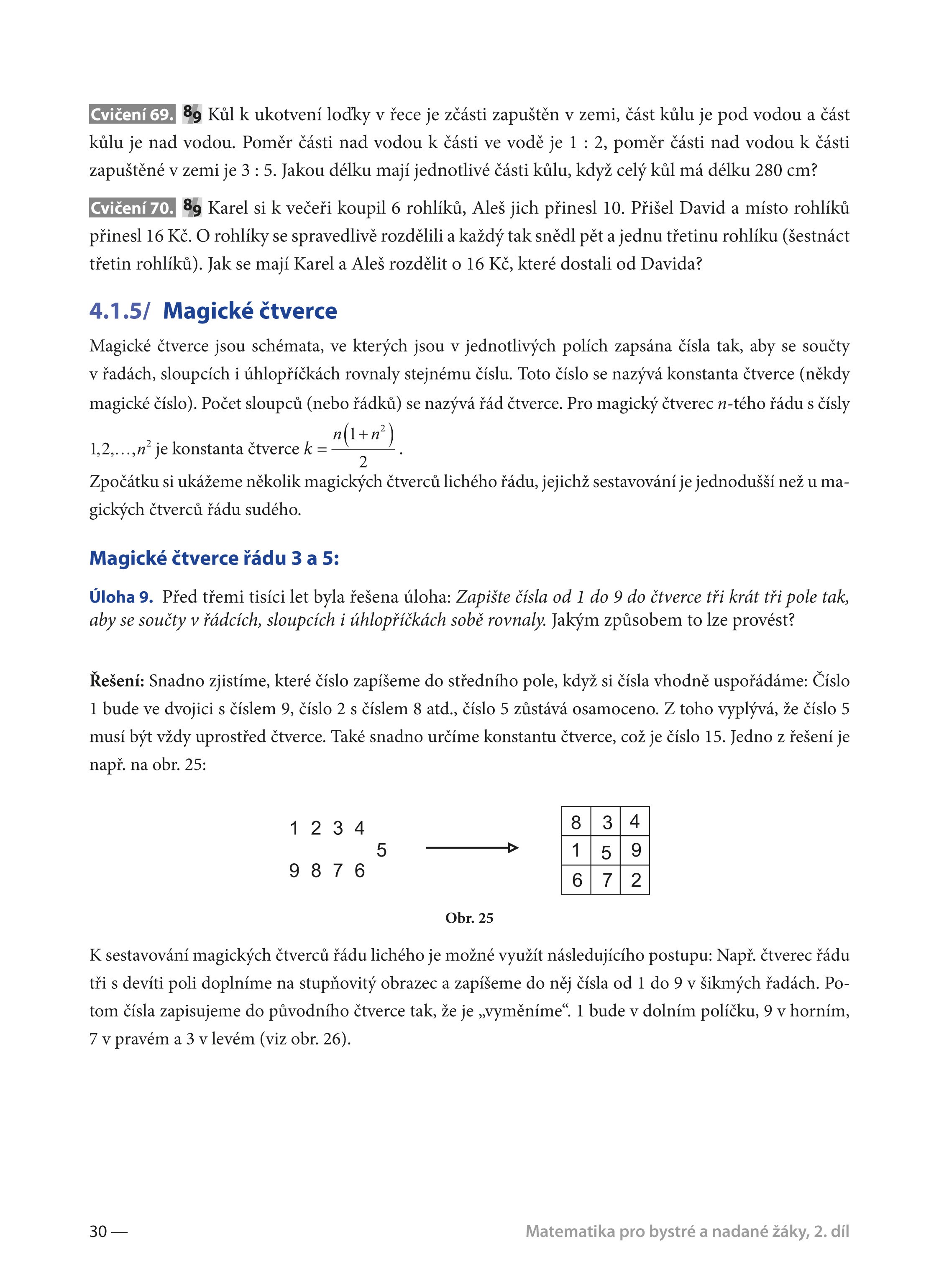 Po mnoho roků se zabýváme nadanými žáky 2. stupně ZŠ a jejich specifickými přístupy k řešení matematických úloh. Za tuto dobu jsme si ověřily, jak je důležité žáky zaměstnávat způsobem odpovídajícím jejich matematickému potenciálu a úrovni myšlení. Nadání se nerozvíjí samo od sebe, je nutné ho podporovat. Všimly jsme si, jak různé mohou být projevy nadaných žáků v matematice. Mnoho dětí se totiž neprojevuje tak, že jsou nadané, ale často jako vyrušující, ignorující, demotivované či líné. Příčinou může být nedostatek adekvátních podnětů v hodinách matematiky, nebo naopak kladení nepřiměřených nároků na nadané dítě. Děti by měly mít z matematiky radost, měly by si osvojovat potřebné matematické znalosti a dovednosti a měly by je být schopny využít v nestandardních úlohách. Tuto publikaci jsme vytvořily s cílem nabídnout učitelům, rodičům, nebo samotným nadaným dětem mnoho zajímavých úloh, které je matematicky obohatí a mohou zvýšit jejich zájem o matematiku. Neřešené úlohy jsou voleny tak, aby poskytovaly různé možnosti přístupu k jejich řešení. Tyto možnosti uvádíme ve výsledcích úloh.