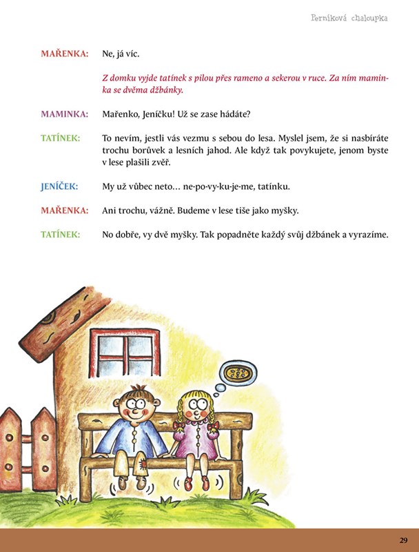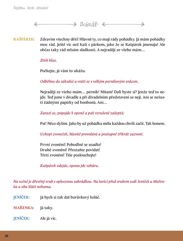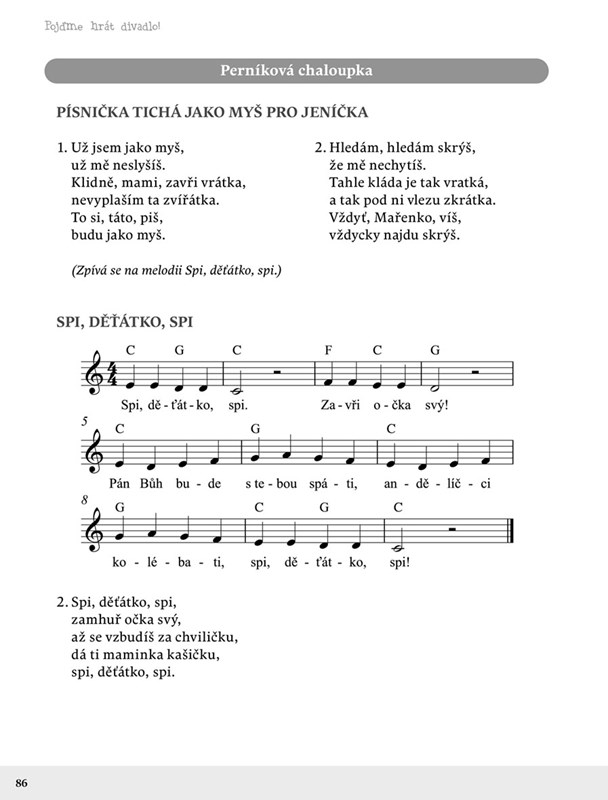 Najdete v něm vše, co budete potřebovat: texty rozepsané do jednotlivých rolí, popisy situací a prostředí, díky kterým si budete moci navrhnout kulisy a kostýmy. Skvělým doplňkem jsou noty a texty písniček na melodie známých lidovek, které můžete do svého představení zařadit a tím ho obohatit o hudební složku.