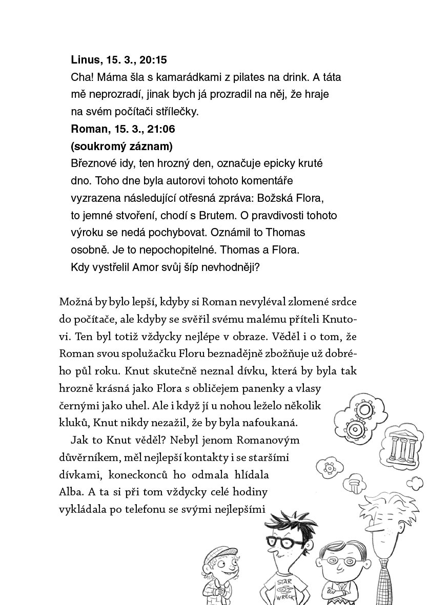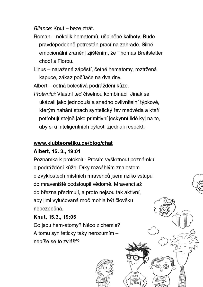 Seznamte se s Linusem, Albertem a Romanem – zakladateli Klubu Teoretiků! Mají blog o číselných kódech a starých Římanech, a o spoustě dalších věcí mají přehled – alespoň teoreticky. V praxi jim musí pokaždé přijít na pomoc Knut, který je sice génius, ale zdravého rozumu má víc než všichni dospělí dohromady. Navíc moc dobře ví, jak vyzrát na otravné sestry nebo nesnesitelné kluky ze sousedství.