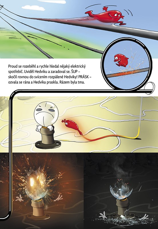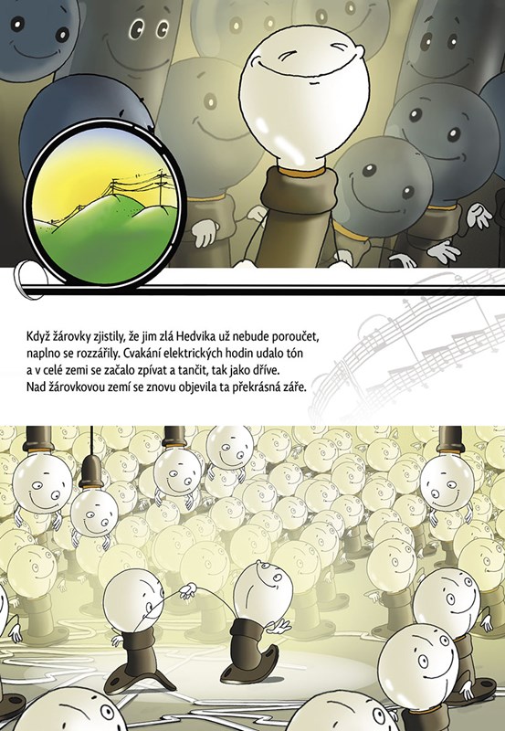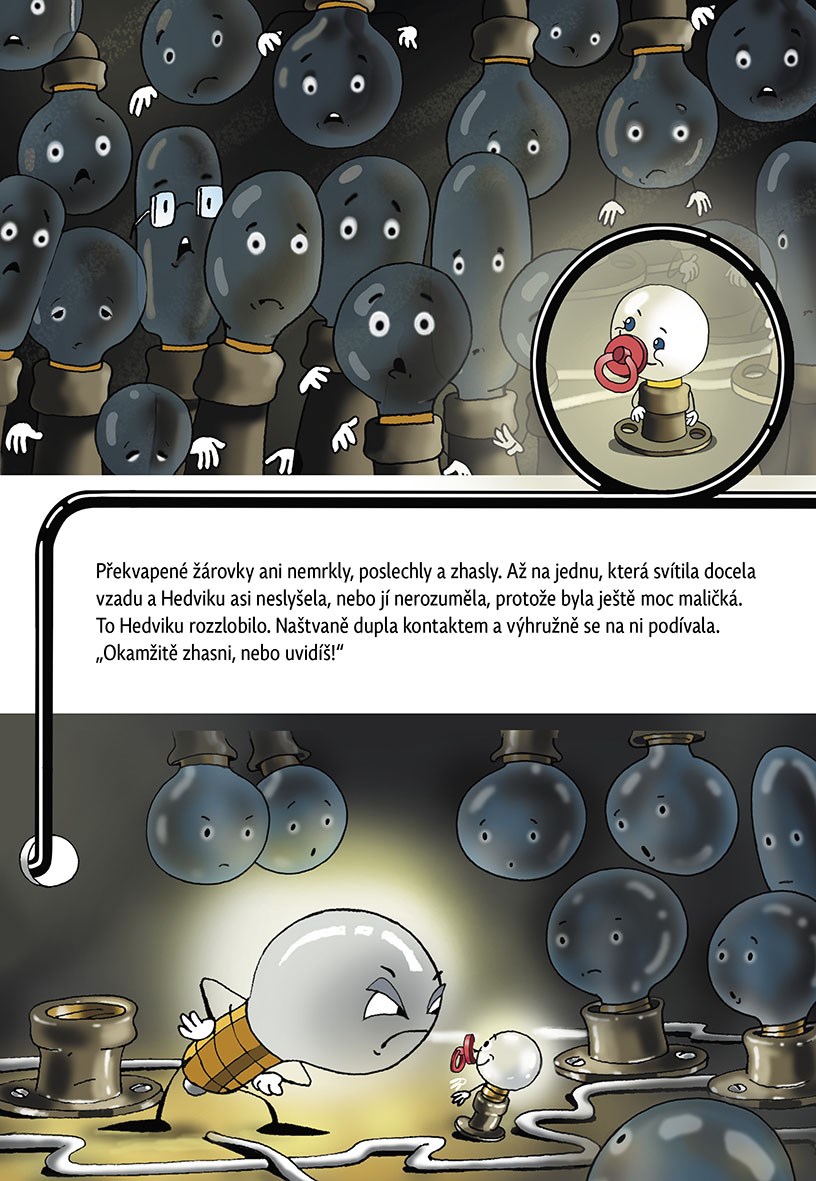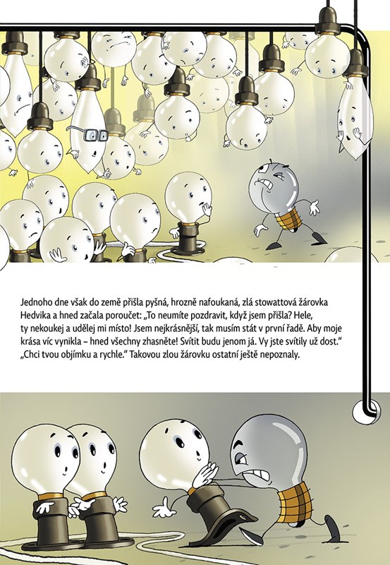 Za stovkou vypínačů, deseti pojistkami a jedním kilometrem elektrických drátů se nachází žárovková země. V té zemi bylo pořád veselo, celé dny se zpívalo a tančilo. Pak ale přišla jedna pyšná, hrozně nafoukaná stowattová žárovka Hedvika a začala všem poroučet...