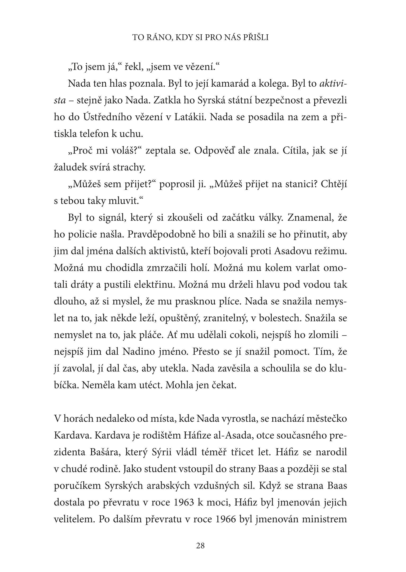 Téma občanské války v Sýrii plní již několik let zpravodajské relace sdělovacích prostředků na celém světě. Jako čtenáři a diváci masmédií sledujeme reportáže, dozvídáme se o postojích politiků a celou válku už vnímáme spíše jako sled děsivých čísel. Co je však za těmito čísly? Jsou to především osudy konkrétních lidí, kterým válka sebrala domov, blízké, lidskou důstojnost či je donutila k hromadnému útěku ze země. A právě o těchto lidech je tato kniha. Kniha sestávající z osobních výpovědí, které lépe než co jiné ilustrují co je skutečně válka.