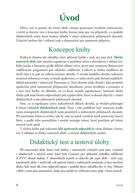 Kniha v úvodu obsahuje stručné informace ke koncepci knihy, k podobě didaktických testů i typům testových úloh. Užitečné mohou být i informace, jak si počínat v průběhu přípravy. Sbírková část přináší rozsáhlou sadu úloh rozdělených podle jednotlivých oblastí učiva. Publikace je následně doplněna o 3 cvičné didaktické testy, které byly sestaveny podle vzoru dostupných didaktických testů použitých u jednotných přijímacích zkoušek v minulých letech. V závěru knihy pak naleznete klíč správných odpovědí ke všem úlohám v knize.