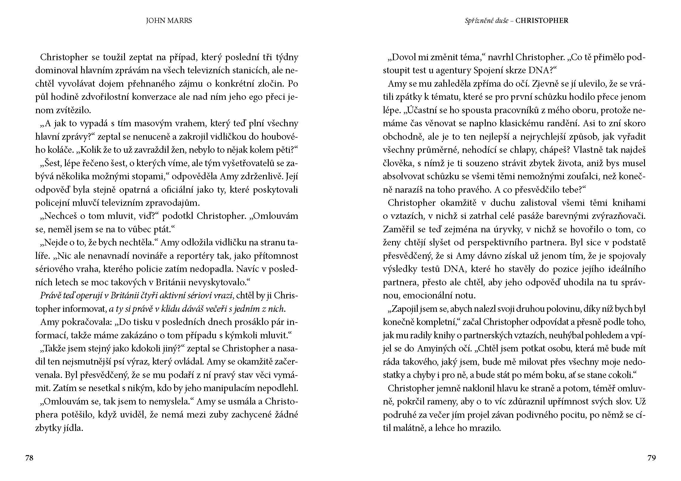 Originální a čtivý thriller Spřízněné duše vás uvede do světa, ve kterém technologie rozboru DNA umí určit, pro koho jste byli geneticky stvořeni. Průlomová metoda hledání ideálního partnera se rozšíří po světě, v databázi je miliarda lidí. Touto cestou ovšem nejen vznikají nové páry, ale dochází i ke spoustě rozchodů. Co to přinese objeviteli genu? A co teprve změněná realita v rukou psychopata? Zdá se, že ani spojení skrze DNA člověku nezaručí štěstí.
