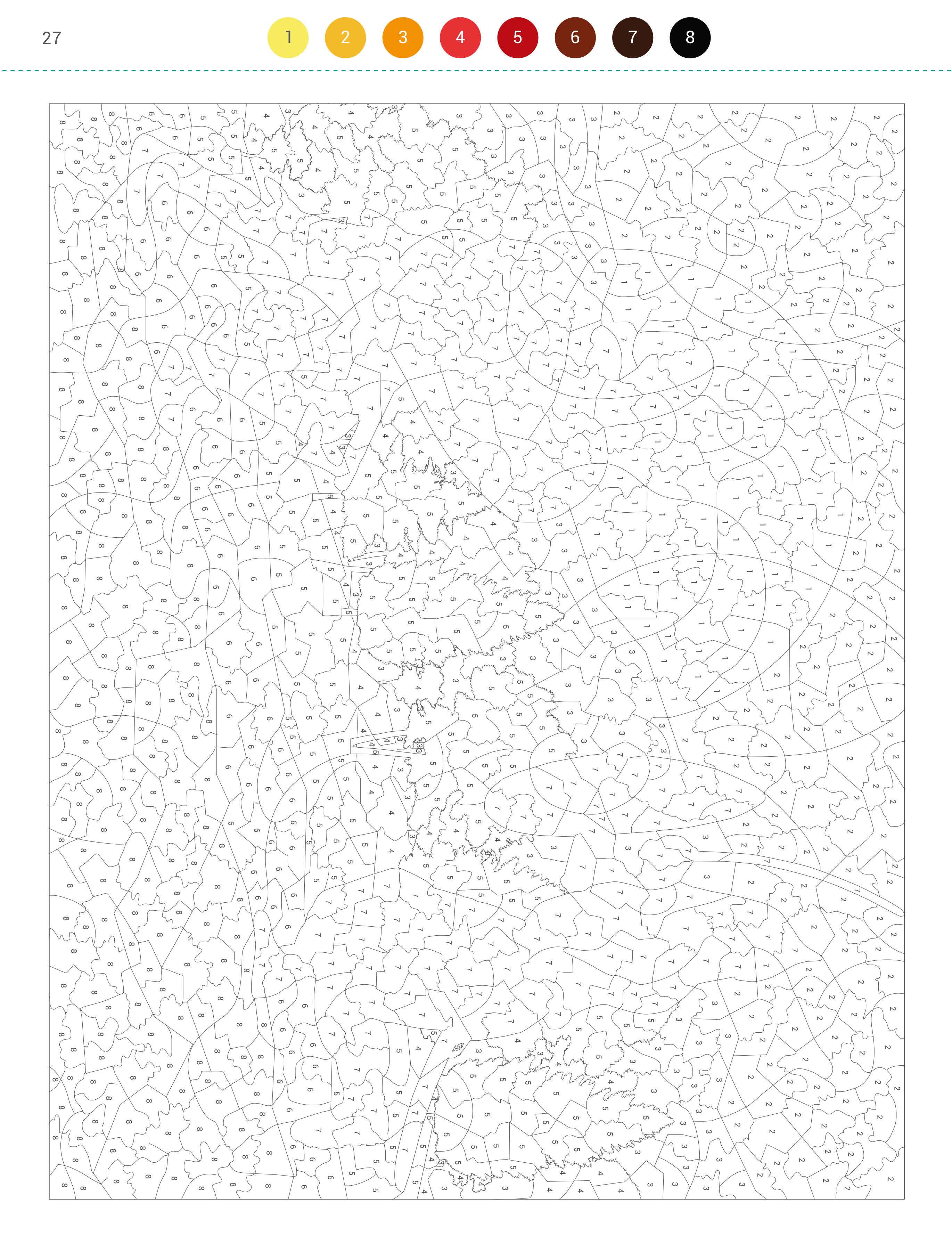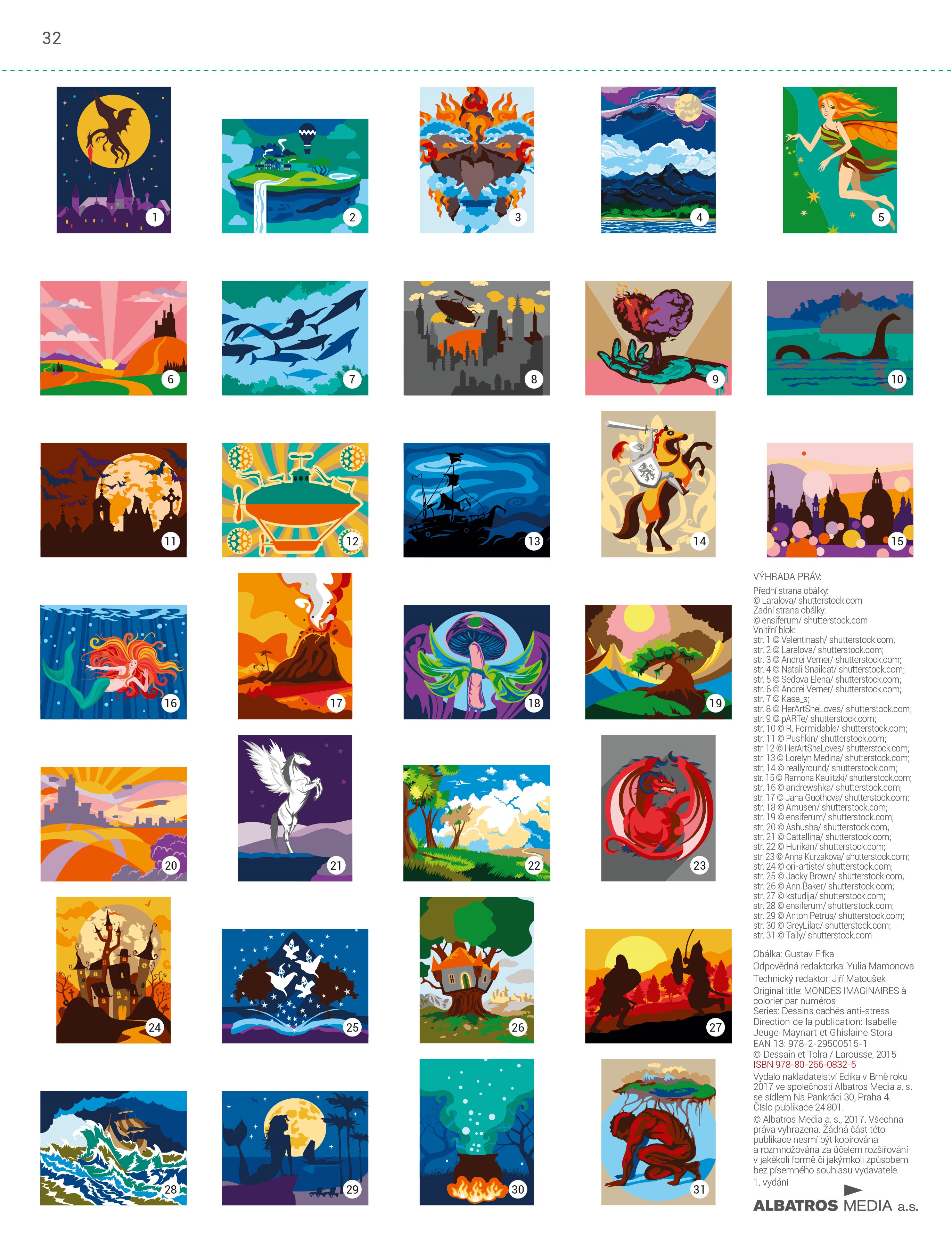 Objevte světy plné tajemství a podivuhodných bytostí! Na stránkách této knihy se skrývá přes 30 fantastických stvoření a kouzelných říší. Abyste je našli, stačí vzít do rukou různobarevné pastelky či fixy a řídit se instrukcemi. Každý obrázek je rozdělen do několika políček označených číslem. Číslo vám napoví barvu, kterou má být políčko zakresleno. Seznam barev je vždy uveden v horní části stránky.