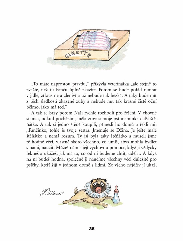 Jmenuji se Fanča a jsem stará, moudrá psice mopsice. Jsme tři holky, dvě mopsí a jedna kočičí – perská kočka, a všechny žijeme s Naší ve starém domě u řeky, kde se říká „na náplavce“, blízko ještě staršího mostu. Všeho, co se děje kolem nás, si bedlivě všímám a zapisuji si to za svoje černá ouška. Budu vám vyprávět, jak to u nás na Malé Straně, v našem domě a na náplavce, chodí v zimě. To byste koukali, co se tam všechno může stát!