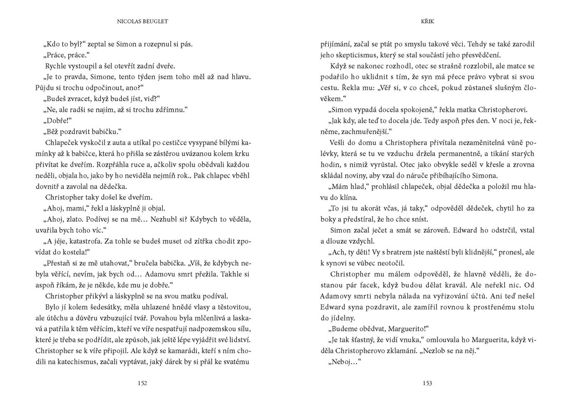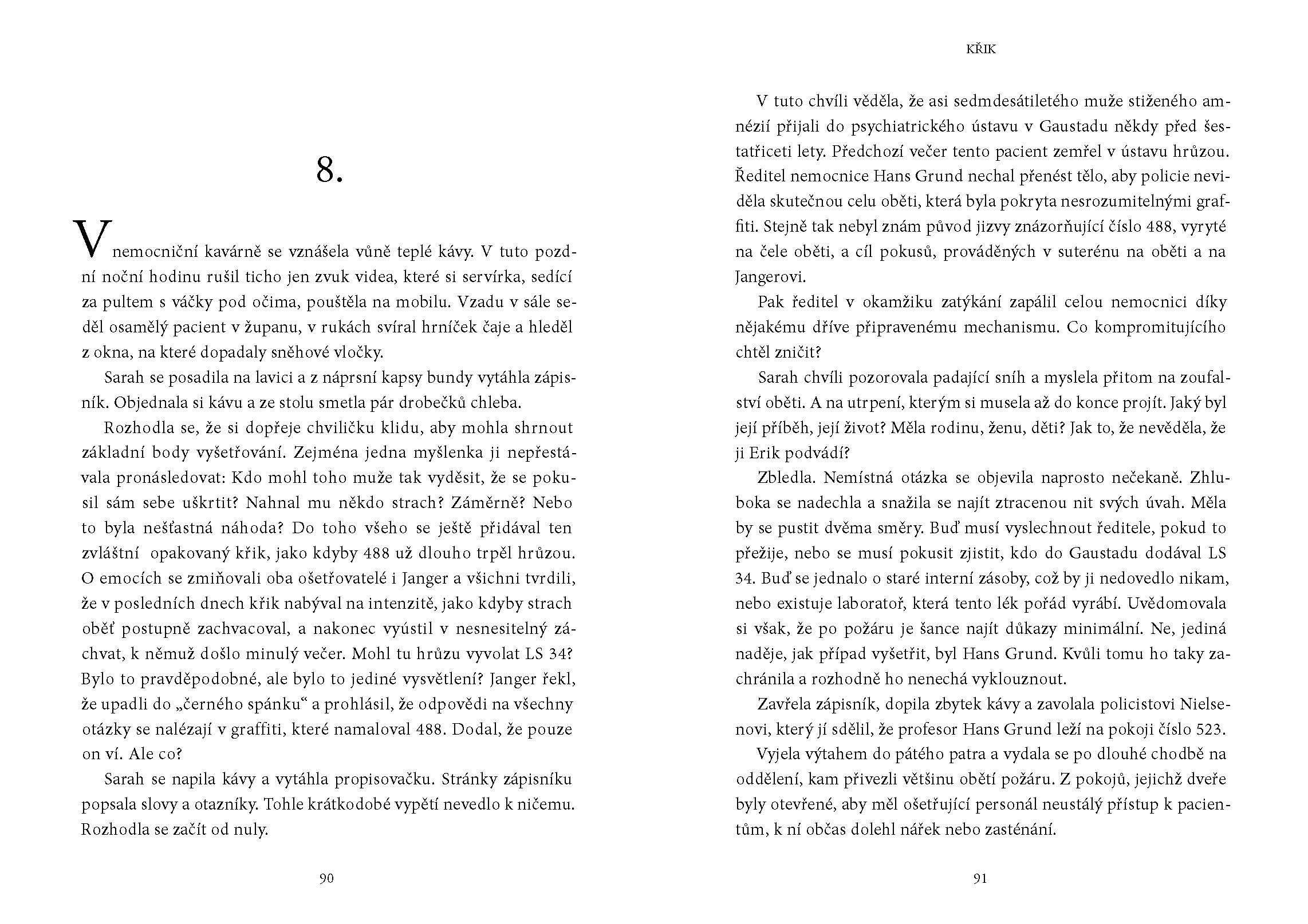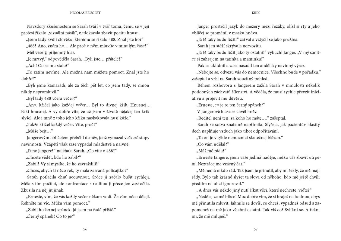 Uprostřed mrazivé noci jsou policisté povoláni k rutinnímu případu úmrtí v psychiatrické léčebně. Tělo pacienta, který uškrtil sám sebe, je nalezeno s ústy otevřenými v tichém výkřiku. Inspektorka Sarah Geringënová cítí, že tady něco nesedí. Co znamená jizva na čele oběti? Co představují kresby na stěně? Vyšetřování zločinu zavede čtenáře přes Oslo, Paříž, Londýn a Minnesotu až k otázce, která fascinuje snad každého: existuje posmrtný život?
