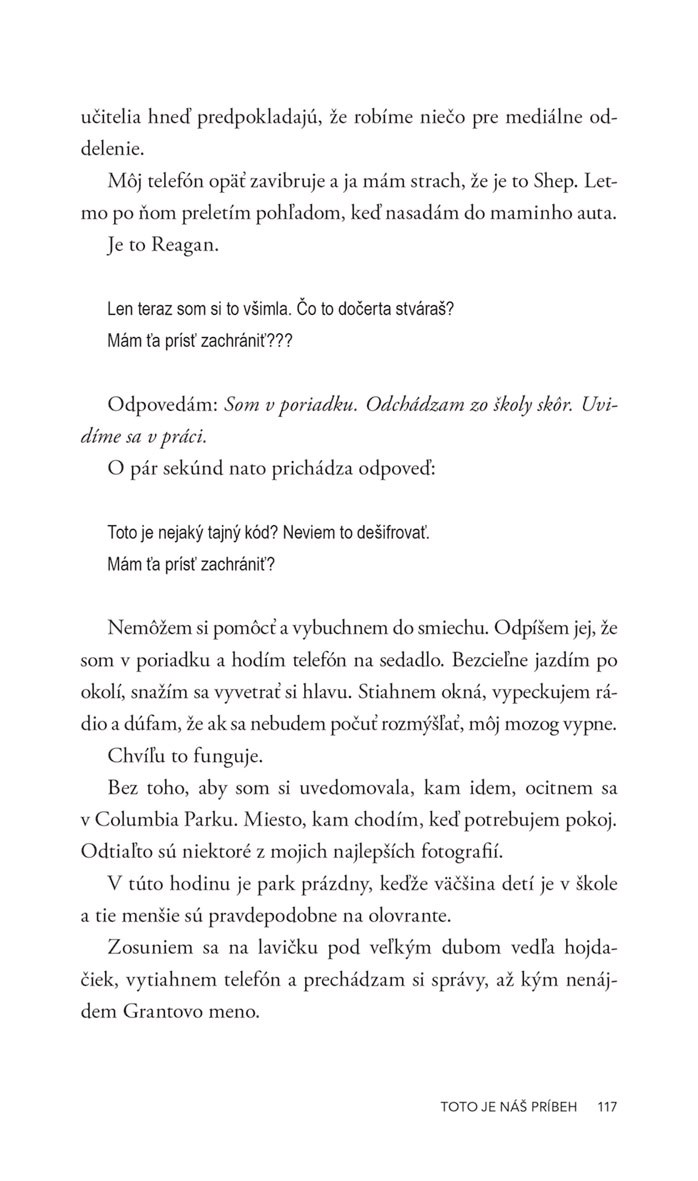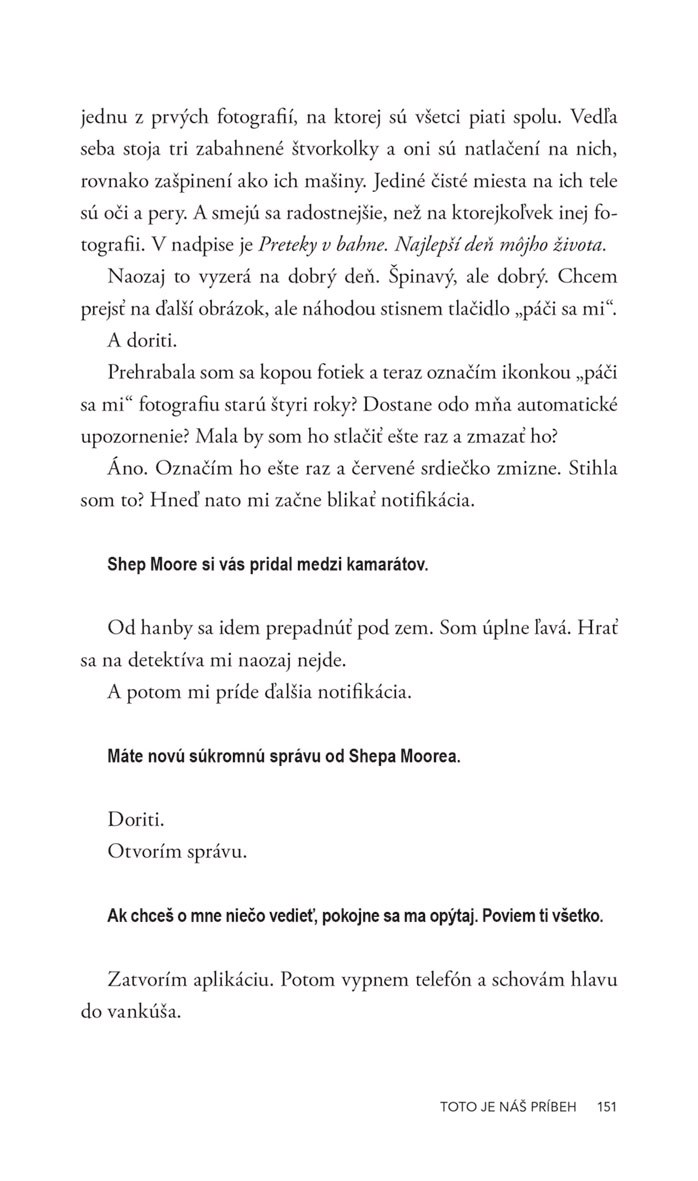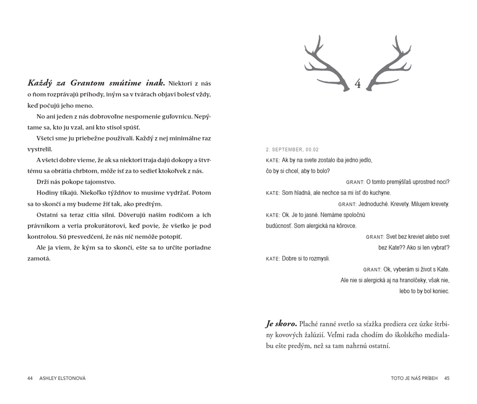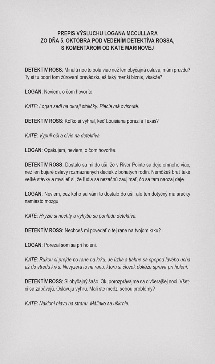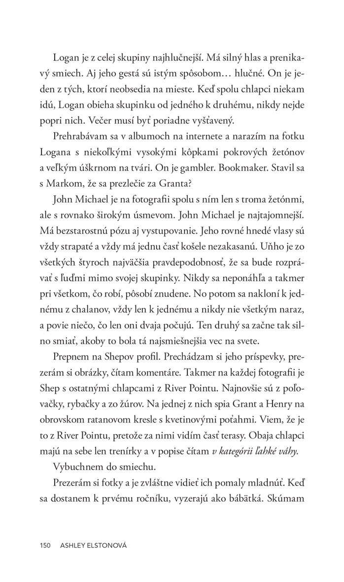 Prvá moja myšlienka pri čítaní tejto knižky? ,,Milujem chlapčenské pohľady!" Ibaže toto moje nadšenie opadlo po prvej stránke, pretože som zistila, že chlapci z River Pointu sú síce hlavnými postavami, no nič nám priamo, a špeciálne mne ako čiteteľke, nehovoria. Jediná osoba, ktorá okrem rozprávačky Kate dostáva slovo je vrah Granta Perkinsa, ale až do poslednej stránky nikto, ani vy, ani Kate, ani jeho najlepšeí kamoši, netušia, kto týmto hlasom vlastne je.