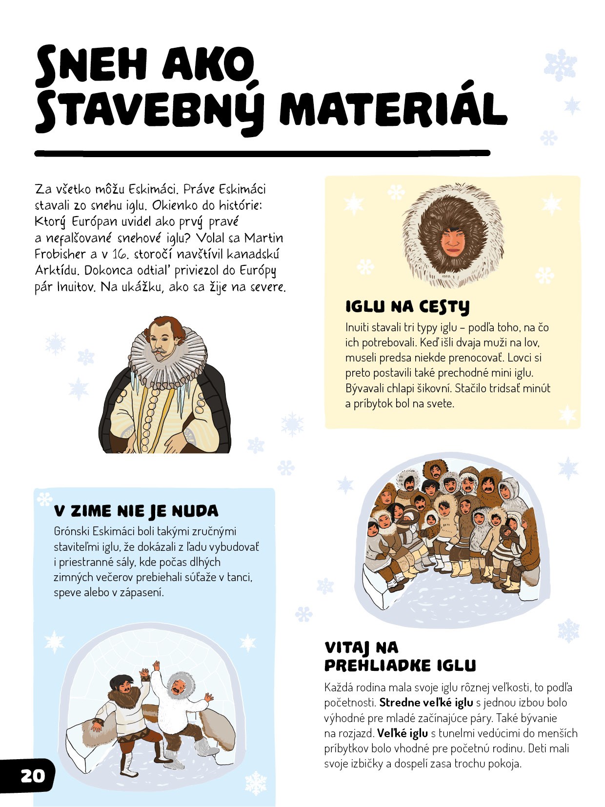 Nie je nezvyčajné, že sneh môže slúžiť ako stavebný materiál. Iglu je typickým príbytkom Inuitov a ľadové hotely patria medzi populárnu atrakciu turistov – aj tieto informácie v kapitole „sneh ako stavebný materiál“ kniha obsahuje. Poslednú kapitolu tvoria rôzne zaujímavosti, ktoré so snehom a ľadom súvisia – osudový náraz Titanicu, snežný muž Yetti či sneh na Marse.