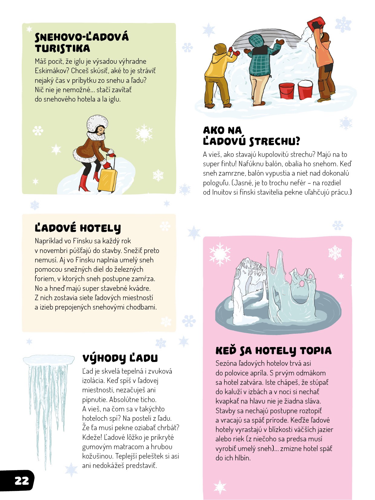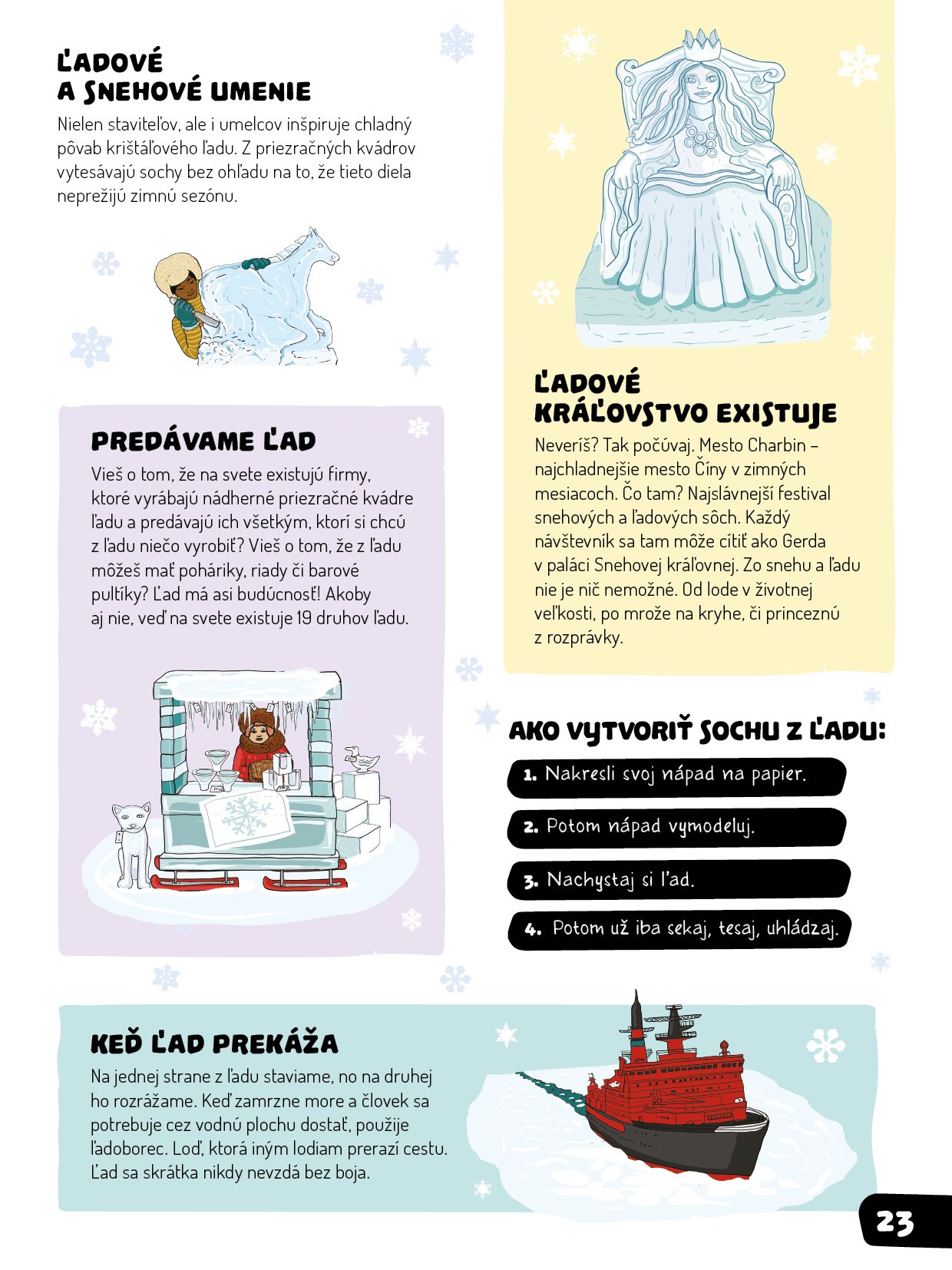 Človek v zime využíva sneh a ľad na rekreáciu. Môžeme sa sánkovať, lyžovať či korčuľovať. Kniha podnecuje dieťa veľa sa pýtať. Ako sa vyrába umelý sneh a čo je lavína? Kto nám pomôže, ak sa stratíme v zasnežených horách? Veľmi ma zaujala myšlienka, že odpovede na tieto otázky dieťa nenájde len v samotnom texte knihy, ale aj v ilustráciách. Práve tie ho môžu priviesť na odpoveď ešte predtým, ako si odpoveď na svoju otázku prečíta. Tento proces je veľmi dôležitý pre rozvoj fantázie, pretože dieťa si môže predstavovať, čo všetko sa zo snehu dá postaviť, čo by si vzalo na polárnu expedíciu a podobne.