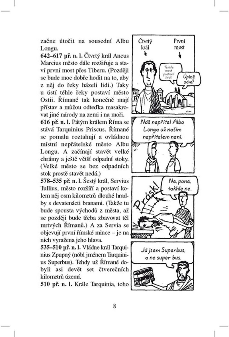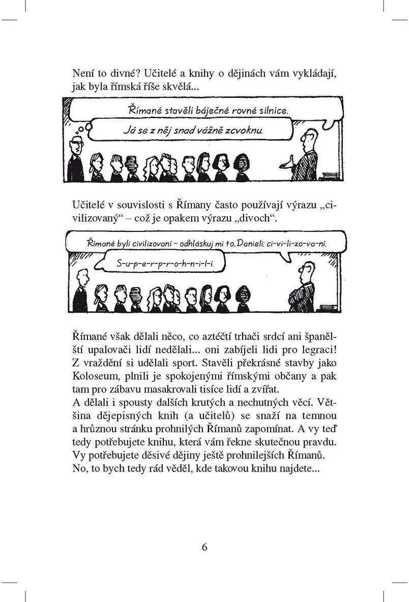 Kniha Krutí Římané odhaluje smutnou pravdu o největší evropské říši všech dob – od nevycválaných dvojčat, která založila Řím, až po kruté císaře, kteří prohlásili vraždění za sport. Dozvíte se například, který císař jedl velbloudí chodidla, proč kráva na střeše přináší smůlu, jak se jmenovala římská bohyně dveřních pantů. Přečtěte si také o krvavých výjevech ze slavného Kolosea, kde Římané hromadně masakrovali lidi i zvířata. Vyzkoušejte si, jak se žilo římským legionářům, a prověřte znalosti svého učitele pomocí našich odporných římských faktů.