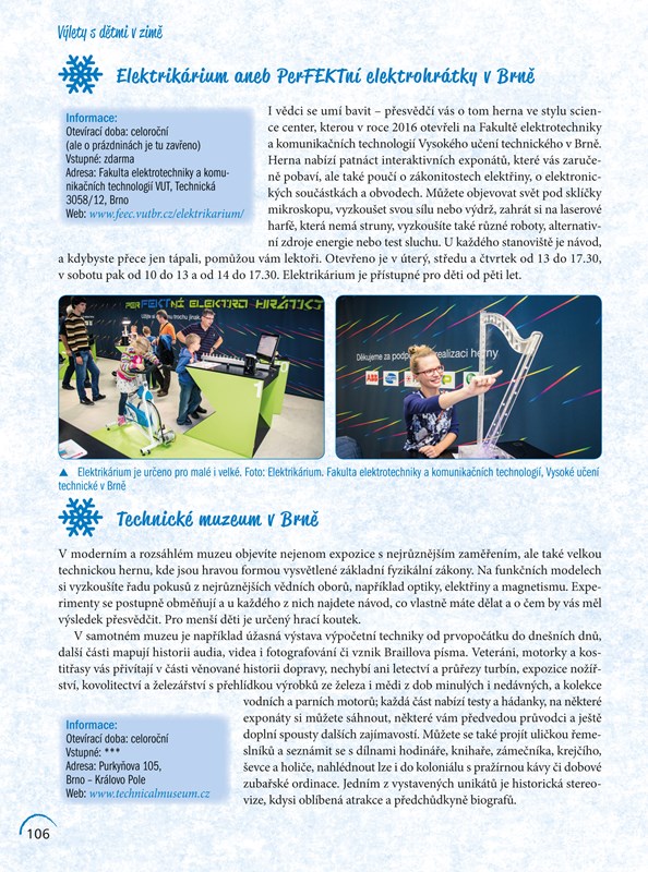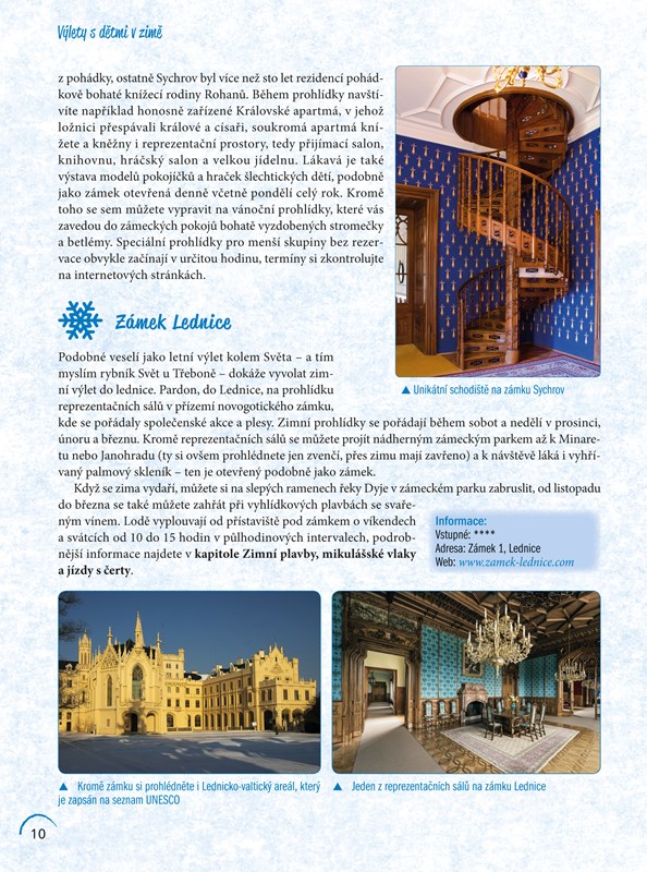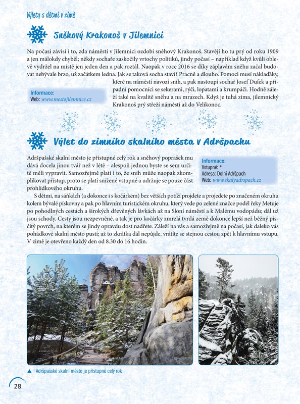 Rádi byste s dětmi v zimě něco podnikali, ale nic kromě lyžování a procházky Vás nenapadá? Tak právě pro vás je určena tato knížka. Najdete v ní tipy na zimní plavby či mikulášské jízdy parním vlakem. Objevíte kouzlo ledopádů a zasněžených skalních měst, projedete se na bobové dráze. Prozkoumáte krypty, jeskyně i štoly a zabavíte se ve vědeckých centrech nebo planetáriích. A ve vánočním čase se můžete podívat na krásné vyřezávané betlémy.
