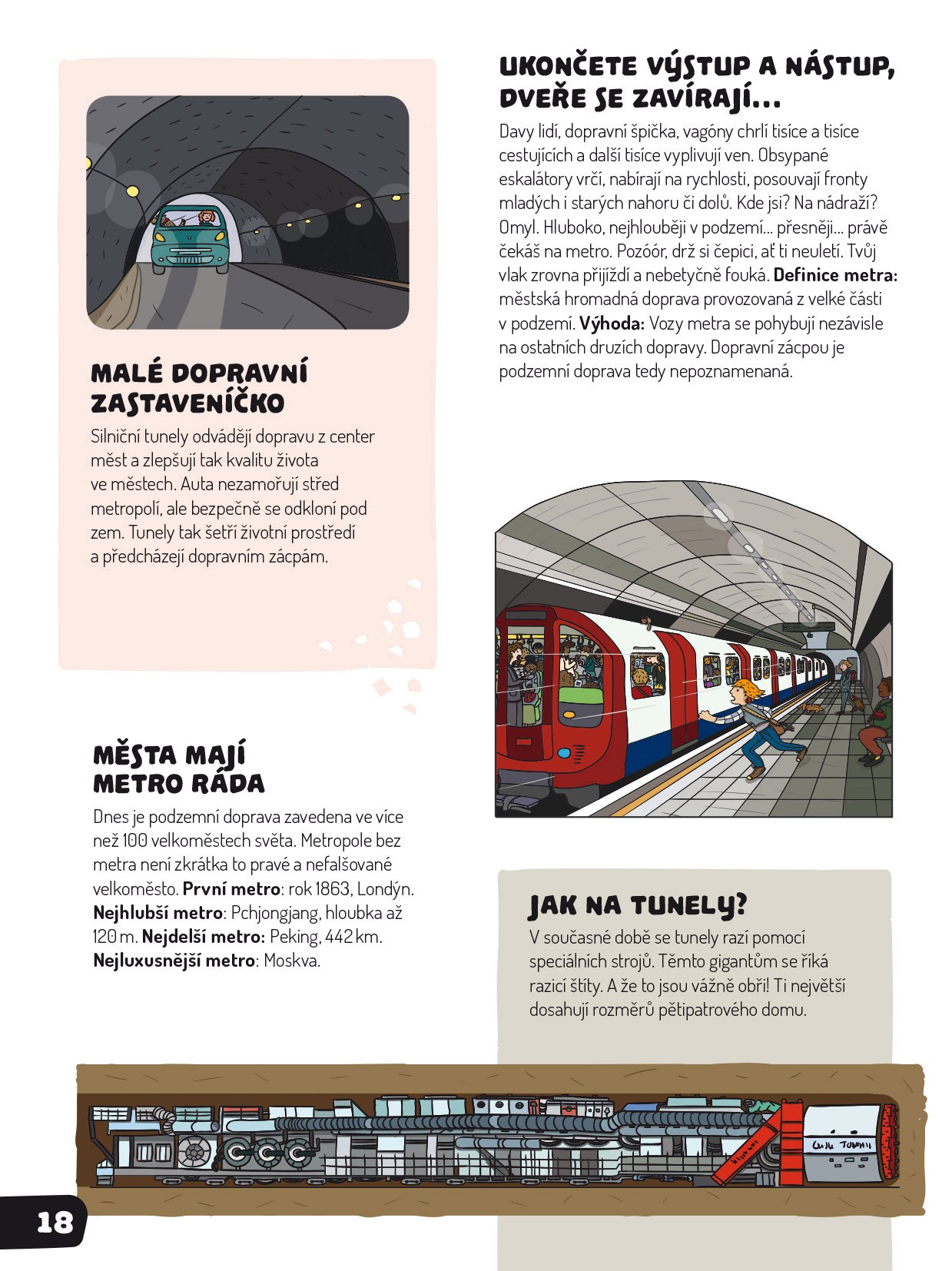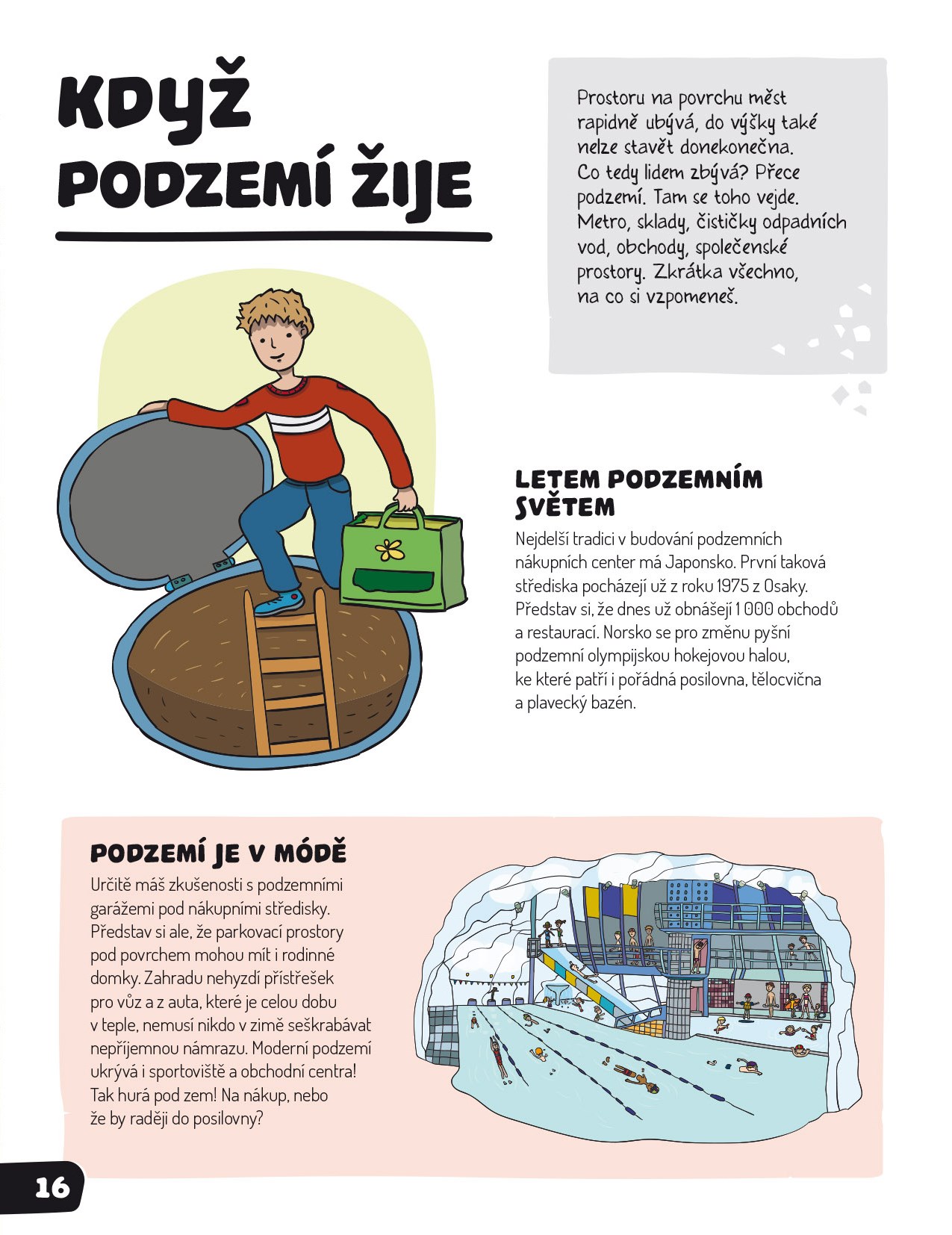 Lidé parkují a nakupují, sportovci cvičí, plavou, milovníci umění si prohlížejí obrazy. Vážně, já si nevymýšlím! V podzemí není žádná nuda, tam to žilo, žije a ještě žít bude! Pokud nevěříš, tak se mnou sestup dolů...níž a ještě níž, až k samotnému jádru. Budeš mít dost odvahy?…Hrozí, že se ti tu zalíbí a nebudeš chtít ven. Nádherné ilustrace, systém rozkládacích chlopní a podrobné informace ze světa pod nohama ti zamotají hlavu. Jen pozor, ať si neumažeš prsty od hlíny.