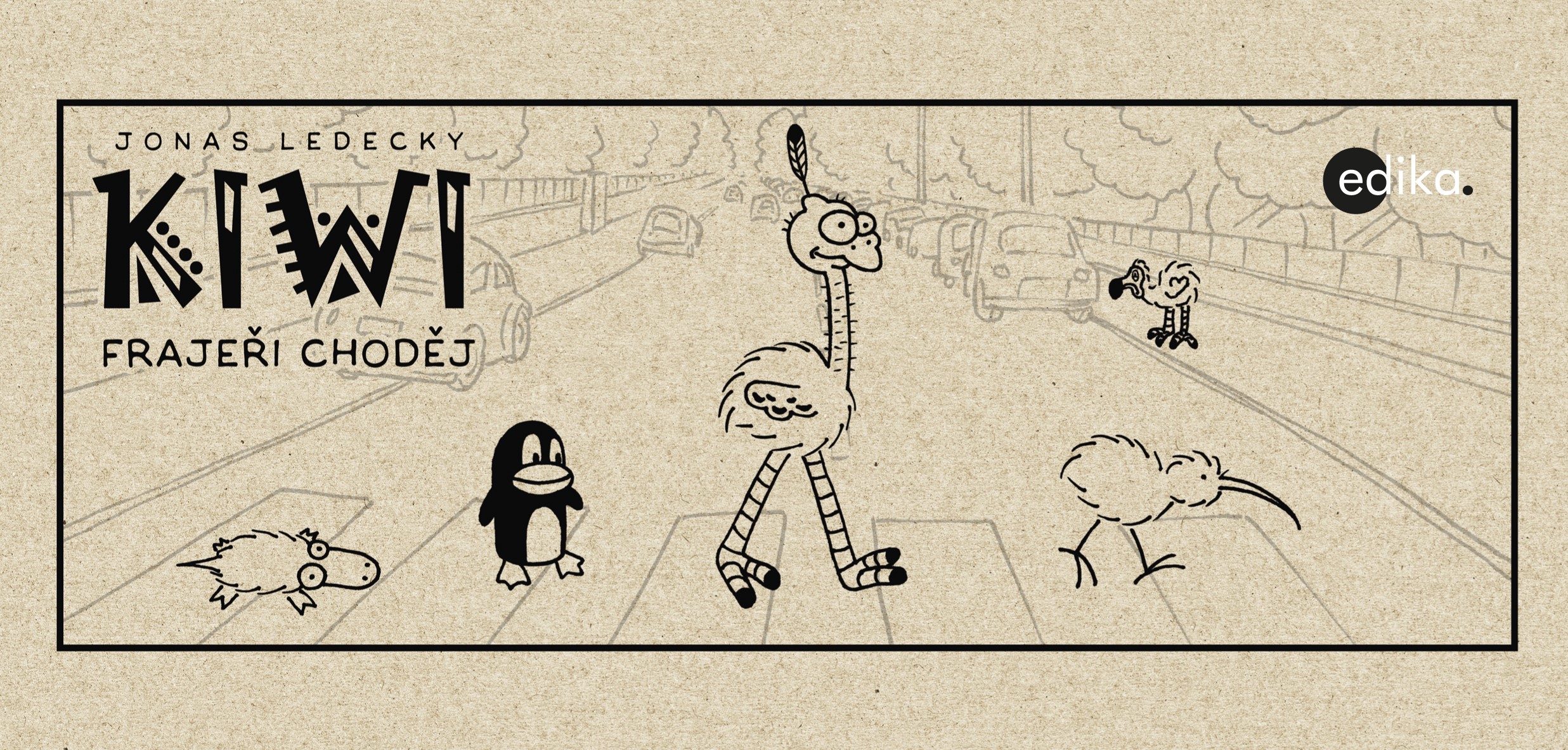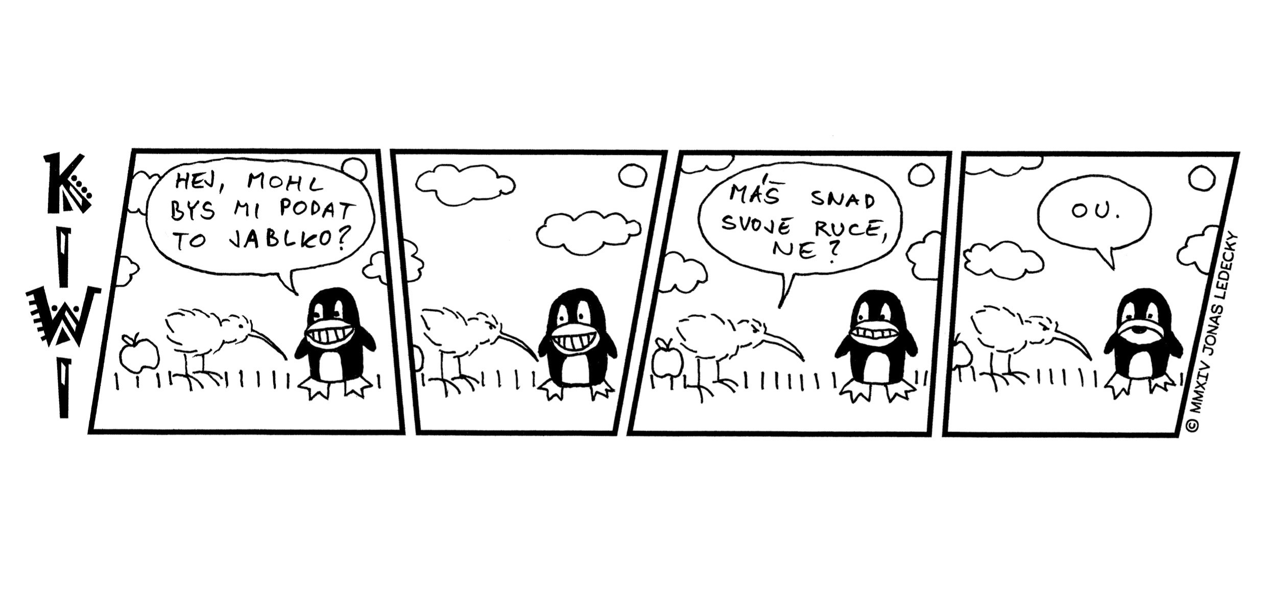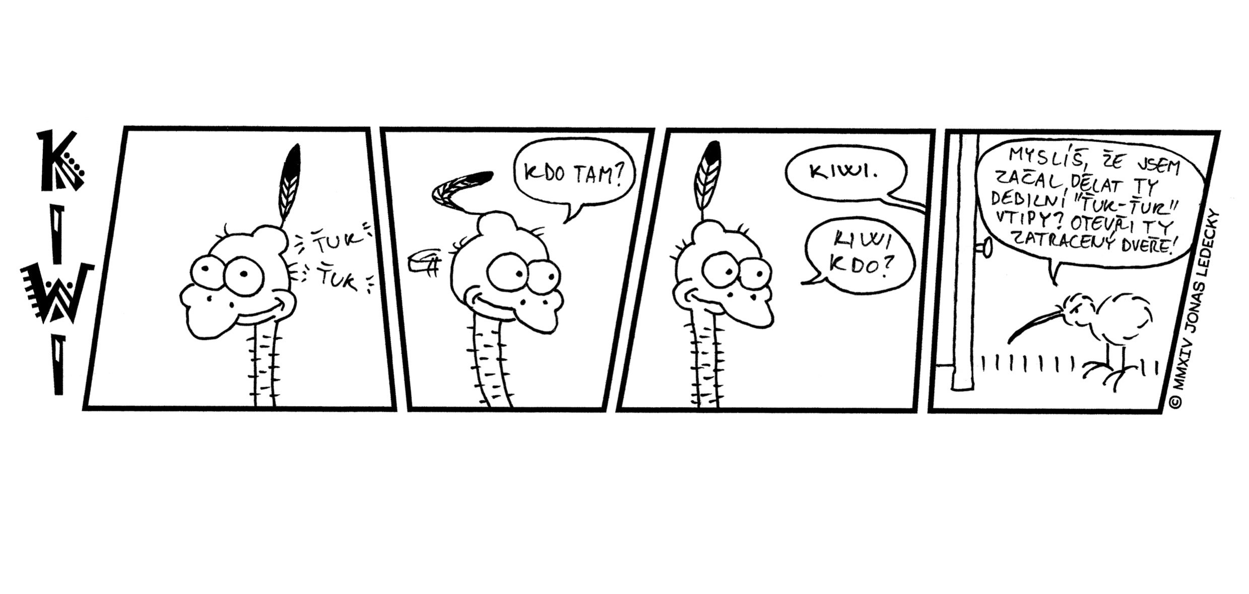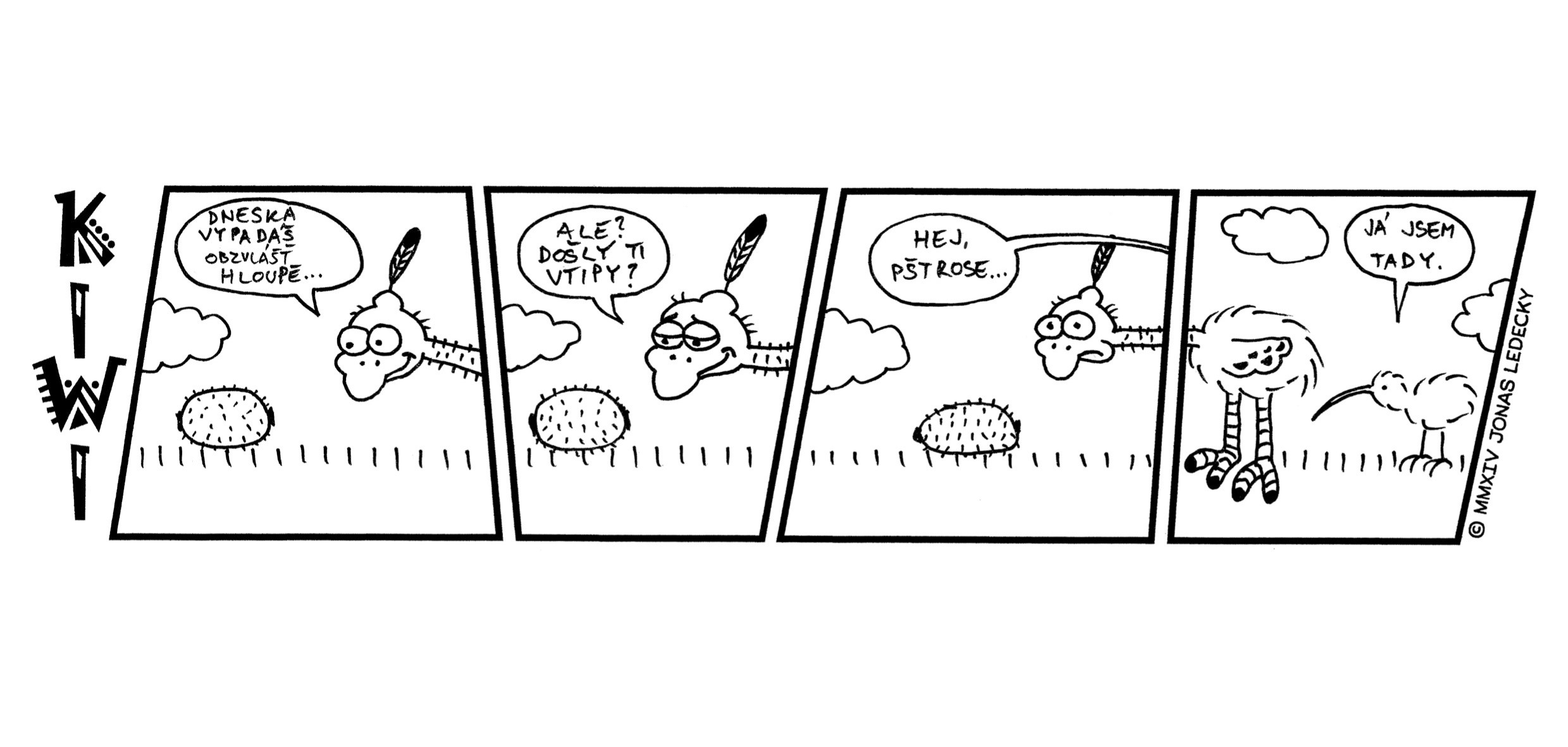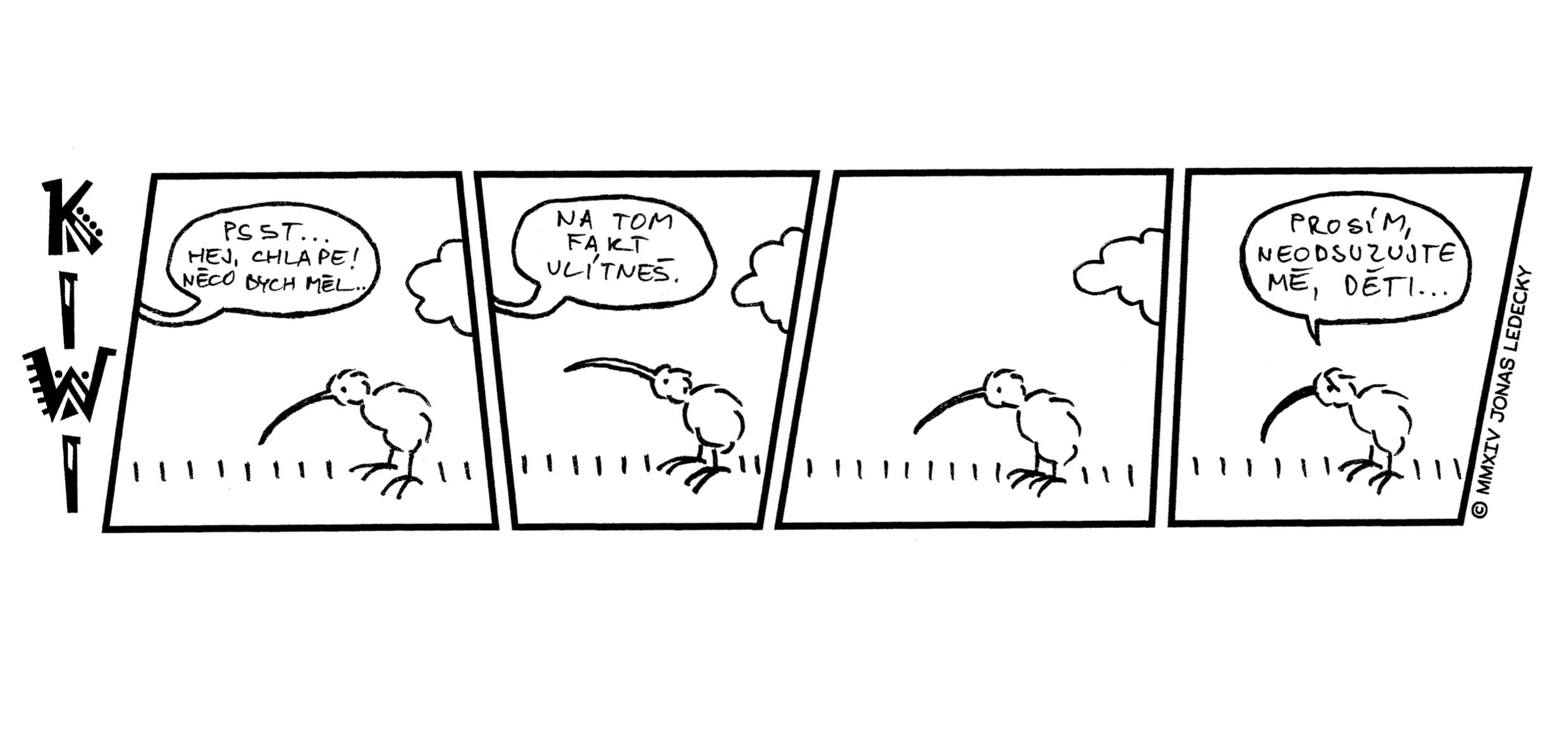 Kiwi je pták, co má křídla a zobák. Ale nelítá... Nezpívá... A ani neplave. Je to pták, který si hledá kamarády podobného ražení. V autorském komiksu Jonáše Ledeckého můžete nahlédnout do jejich světa plného absurdit. Něktěří z vás si určitě vzpomenou na příběhy z prvního dílu komiksu, který Jonáš nakreslil ve škole při hodinách matematiky.