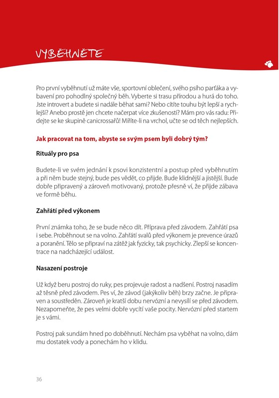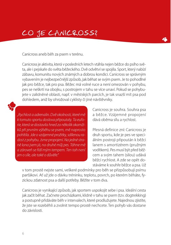 Protože postupně zjistíte, že vaše běhání se psem se vlastně přetavilo do opravdového canicrossu, oceníte v knize rady pro tento sport. Tréninkové plány pro vás i vašeho psa, správná technika běhu, výběr vhodné obuvi a oblečení, výživová doporučení, pitný režim, jak zvyšovat psovi fyzičku a rozvíjet jeho balanc, pružnost a koordinaci, jak ho chladit v tréninku či na závodech, ošetřovat mu tlapky, léčit jeho pohybový aparát. A také jak regenerovat sebe i psa.