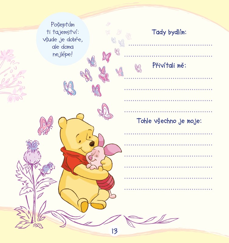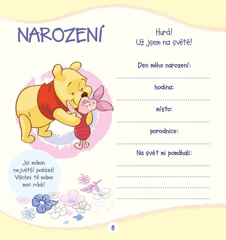 Když se narodí miminko, je každý den něčím neobyčejný. Miminko roste, poznává svět a neustále se kolem něj děje něco nového, co stojí za zvěčnění. Právě k tomu slouží toto album. Najdete v něm místo na vzpomínky, fotografie a obrázky. Stránky pro vás a vaše miminko jsou navíc doplněné roztomilými obrázky Medvídka Pú a jeho kamarádů ze Stokorcového lesa.