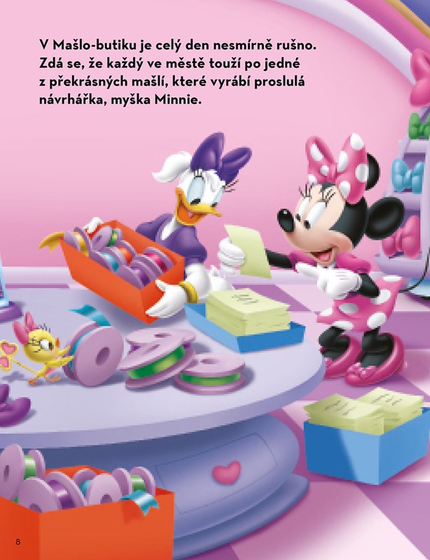 Seznamte se s myškou Minnie, majitelkou úžasného mašlo-butiku. Minnie vám představí své kamarádky-pomocnice a společně zvládnete velkou zakázku pro významnou zákaznici. Pak můžete do zápisníčku napsat něco o sobě, svých přátelích i své rodině a nakreslit pro Minnie pěkné obrázky.