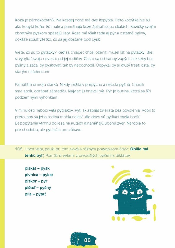 Nedávno sa mi do rúk dostala nová kniha Tomáša Bánika Nehanbi sa skrotiť rysa, ktorá má deťom na prvom stupni základných škôl pomôcť so základmi pravopisu. Knižka je rozdelená na niekoľko častí, pričom v každej časti, resp. kapitole sa autor sústreďuje na jeden gramatický jav, ktorý by deťom mohol robiť problémy. Tento gramatický jav sa objasňuje pomocou dostatočného množstva vhodne zvolených cvičení. Cvičenia sú zoradené od najľahších po najťažšie, aby bol postup detí zjavný a prirodzený, a ich forma je pestrá. Správne odpovede sa dajú dopĺňať alebo vyberať. Oceňujem voľbu textov, pretože im porozumie prvák aj štvrták. Na konci knihy sa – ako to už väčšinou býva – nachádza kľúč správnych odpovedí, podľa ktorého sa dajú výsledky ľahko skontrolovať. Môže to urobiť rodič, starší súrodenec, ale aj dieťa samotné.