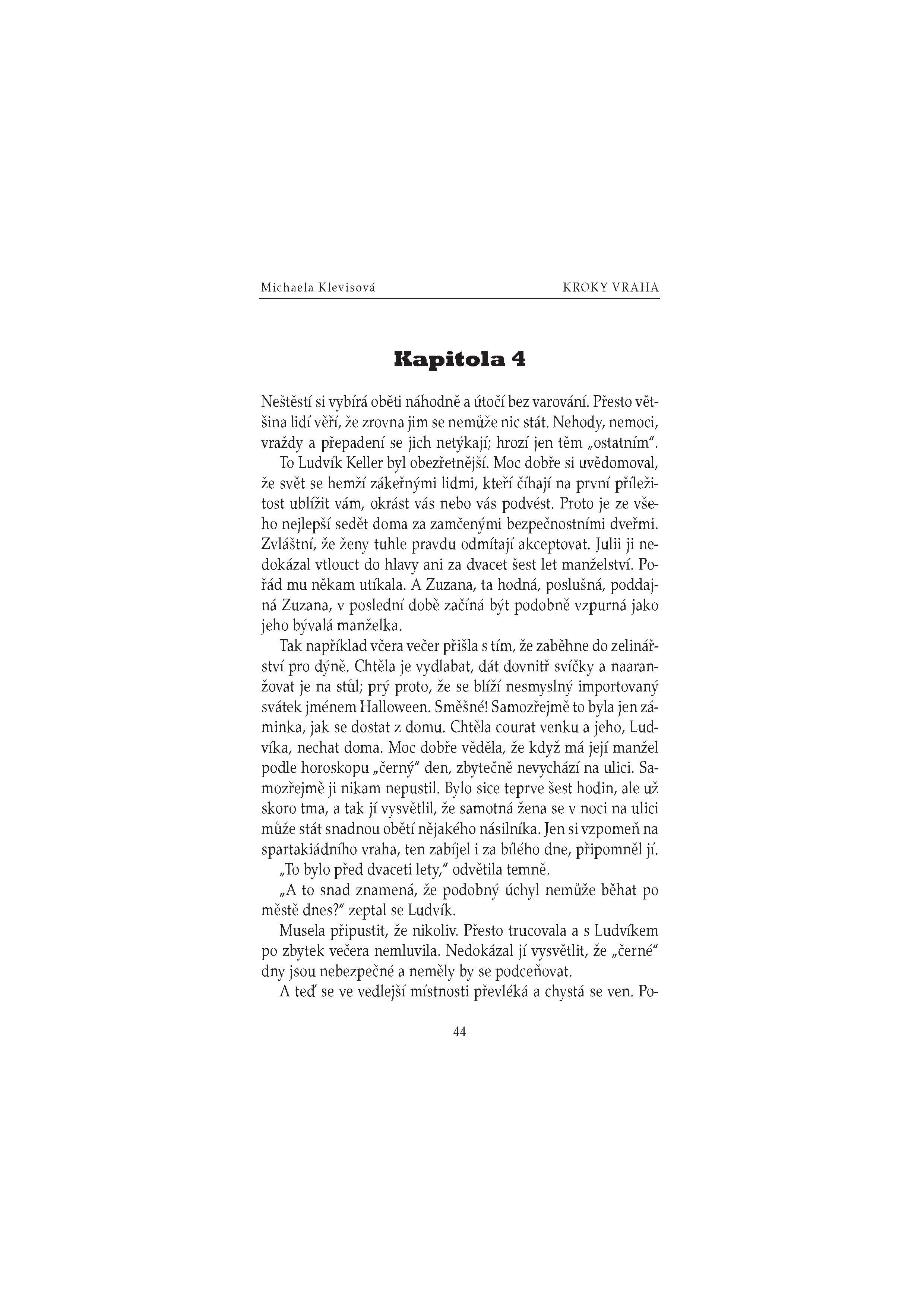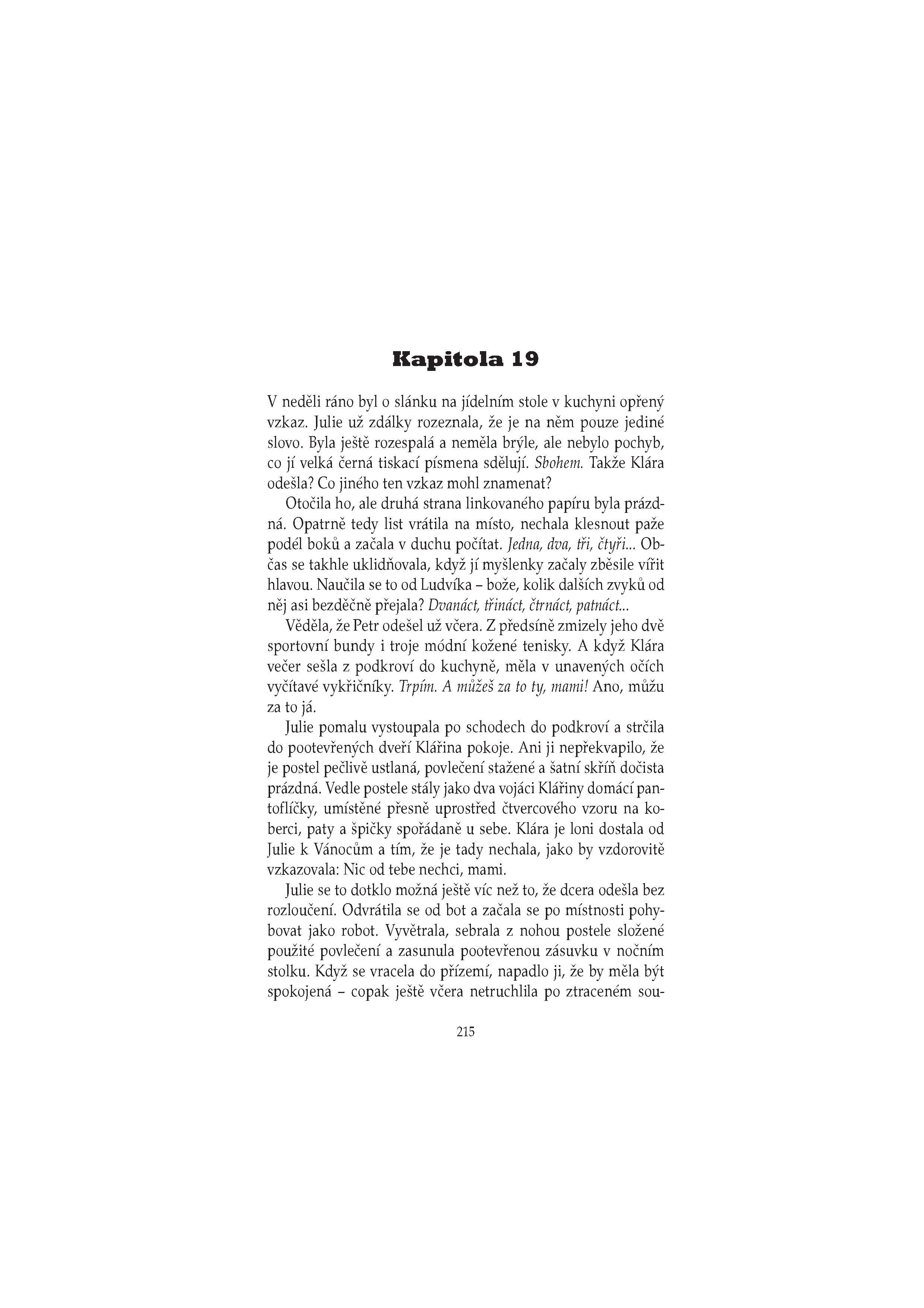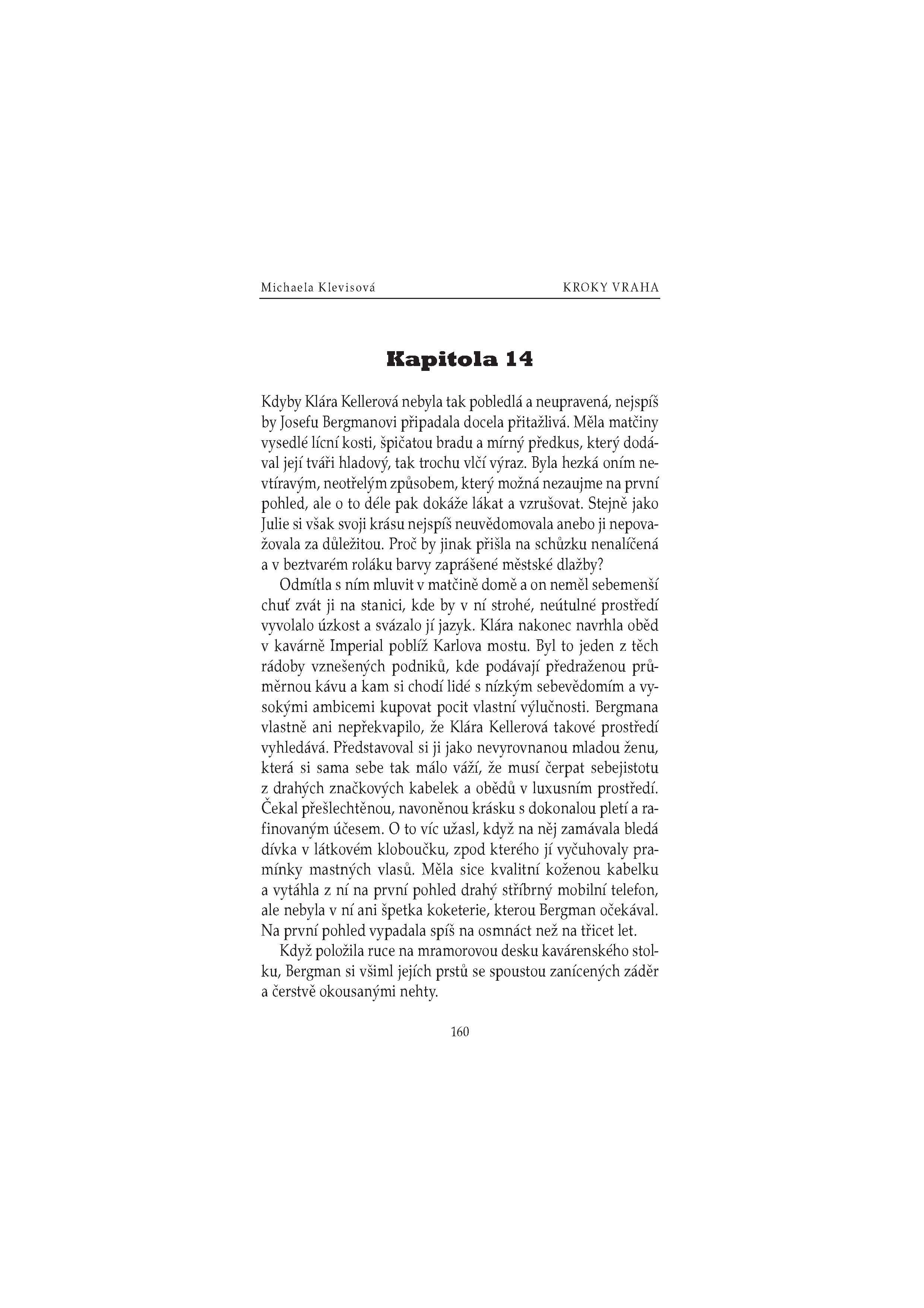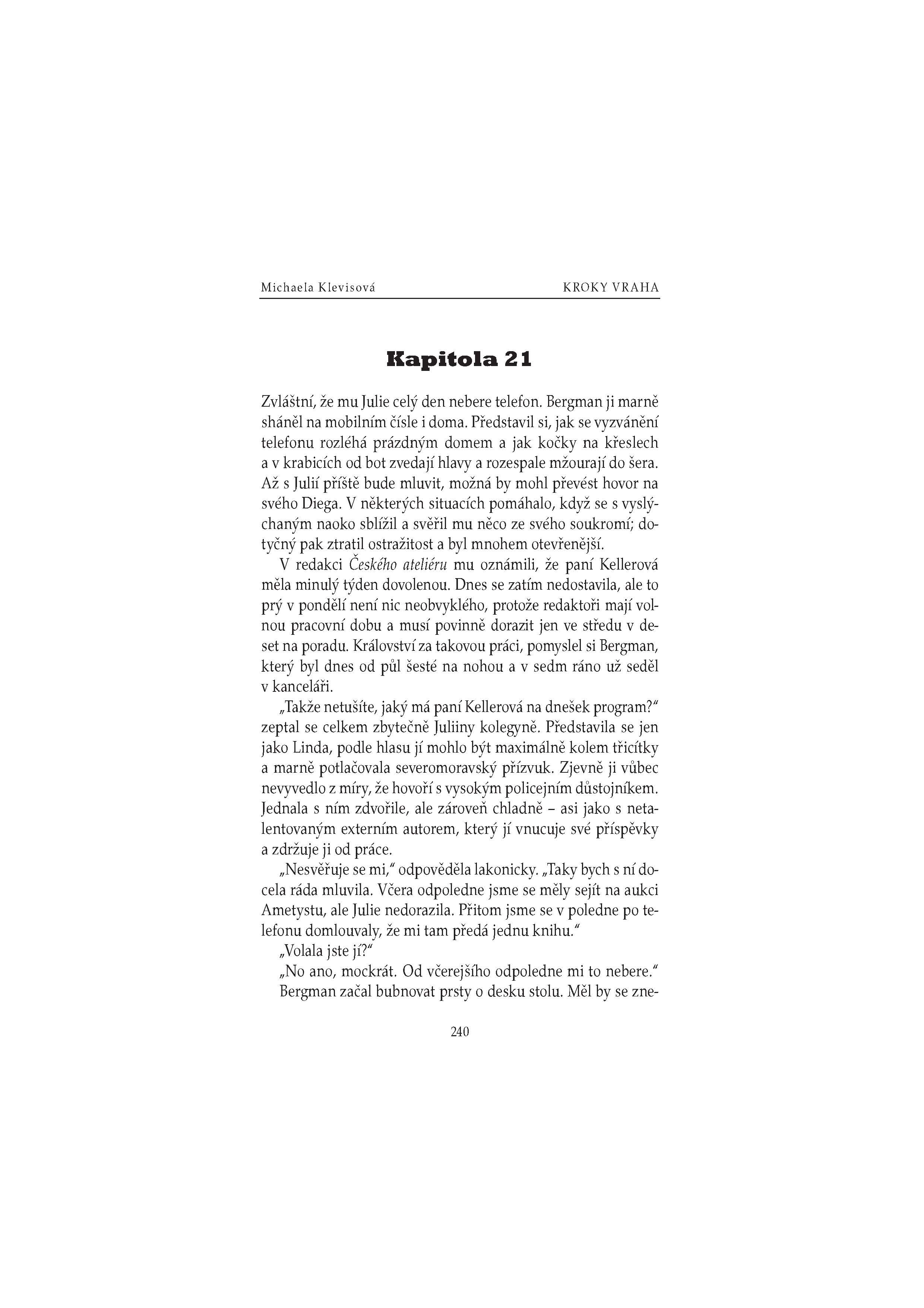V pražském lesoparku byla v noci uškrcena mladá žena. Novinářka Julie Kellerová je zřejmě poslední, kdo s ní před vraždou mluvil. Oběť se navíc nápadně podobala její dceři Kláře. Je možné, aby se vrah zmýlil? Měla by se Klára Kellerová bát o život? Napětí se ještě vystupňuje, když nedaleko místa činu dojde ke druhé vraždě… Sympatický inspektor Josef Bergman rozkrývá složitý hlavolam a odhaluje staré hříchy, důmyslné lži a utajované vášně.