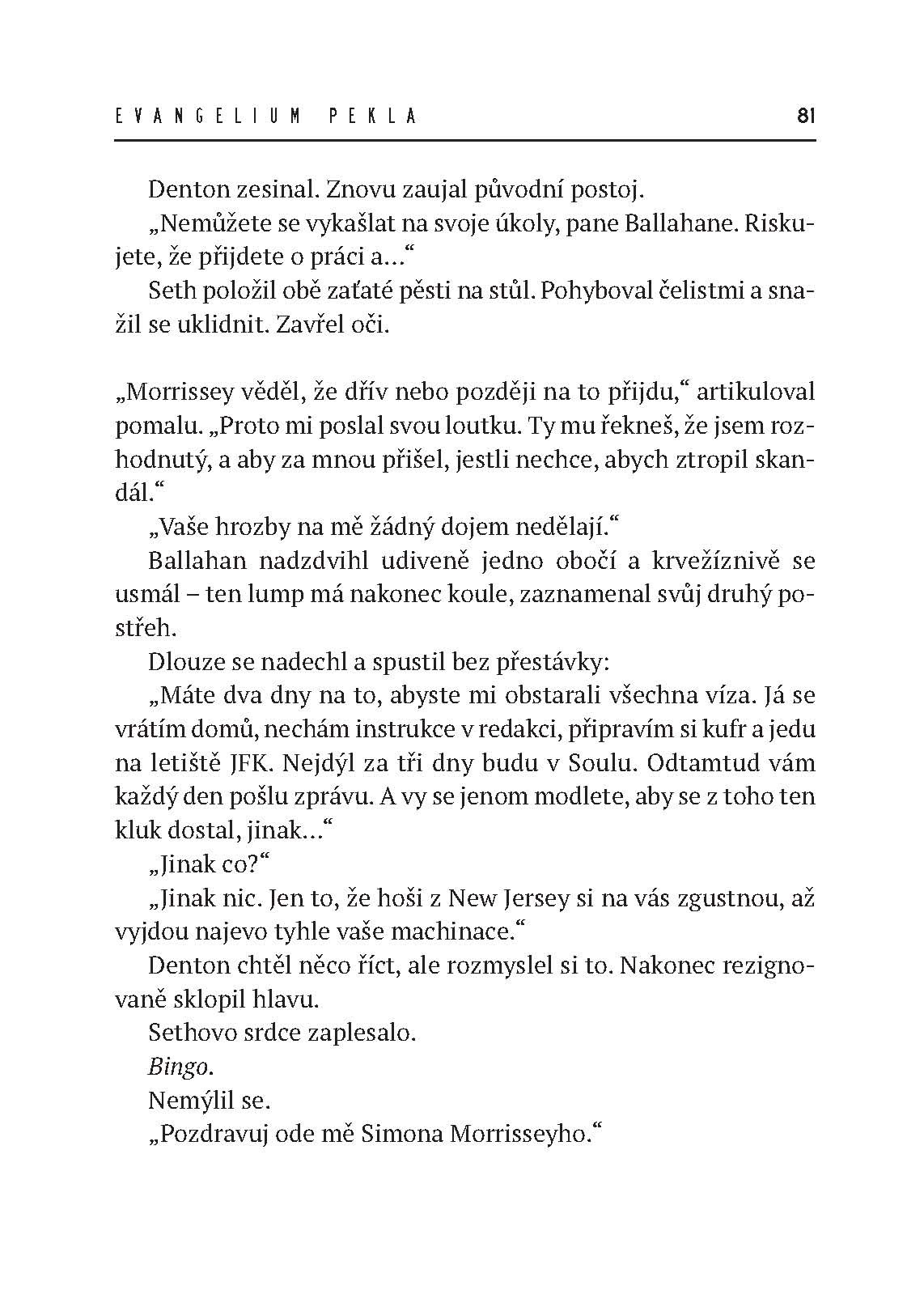 Zasadiť príbeh pre našinca do exotického ázijského prostredia sa vyplatilo. Paik Dong-Soo ako hlavná postava je výborný, ihneď vzbudí váš záujem a chcete vedieť, ako to s ním dopadne. Navonok sa prezentuje ako oddaný vojak, no vnútri tajne túži po slobode a možnostiach západného sveta. Cez neho sa navyše dozvedáme o pomeroch v Severnej Kórei a pri niektorých prvkoch neprestanete žasnúť. Román sa tak stáva nesmiere poučným a jeho hodnota stúpa. Ďalšia postava - novinár Seth - už také veľké sympatie nevzbudzuje. Je protivný, arogantný, neznášanlivý a rasistický. Jeho postoj k Ázijcom je síce vysvetlený skrz rodinnú históriu (starý otec bojoval v kórejskej, otec vo vietnamskej vojne), no napriek tomu na mňa pôsobil ako rušivý prvok a jeho kapitoly som čítal najprv len z rýchlej povinnosti. Až keď sa dostal (konečne) do Kórey, začal sa jeho prerod a od toho momentu aj jeho celkové poňatie. Aj tu sa ukázalo, že Bizien vie, čo robí, a kam chce svoje postavy dostať. Čo mi však predsa len trochu prekážalo, bol autorov štýl. Je tu na súčasný trend pomerne málo dialógov a v drvivej väčšine prevažuje autorská reč. To je však len subjektívny postreh odchovanca dynamickejších textov, dá sa na to navyknúť. Evangelium pekla nastavilo latku vysoko a ak si ju udrží počas celej série, je sa na čo tešiť.