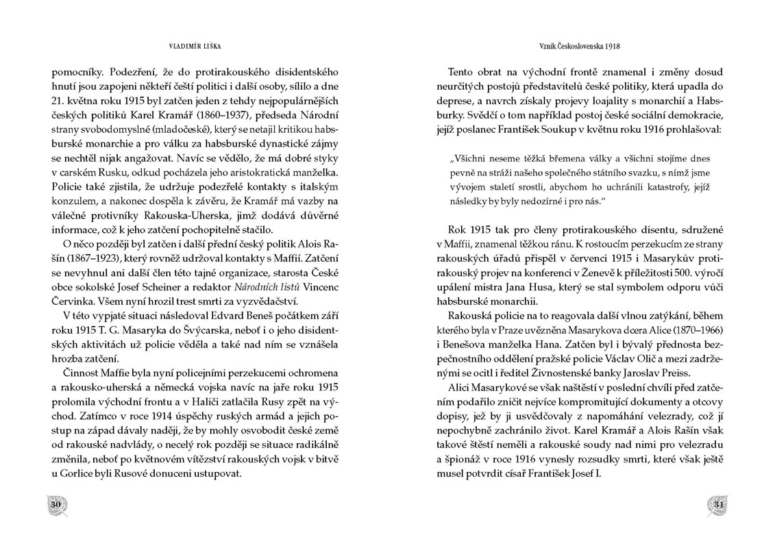 Vladimír Liška nás ve své knize Vznik Československa tentokrát stručně, a přitom přesně seznamuje s vývojem, jenž vzniku Československa předcházel, a dál nás provází charakteristickými problémy, které politická elita nově vzniklého státu musela řešit, ať už se jednalo o velmi napnutý rozpočet, rozevírající se nůžky mezi chudými a bohatými, občanské nepokoje či rozpory mezi samotnými politiky.