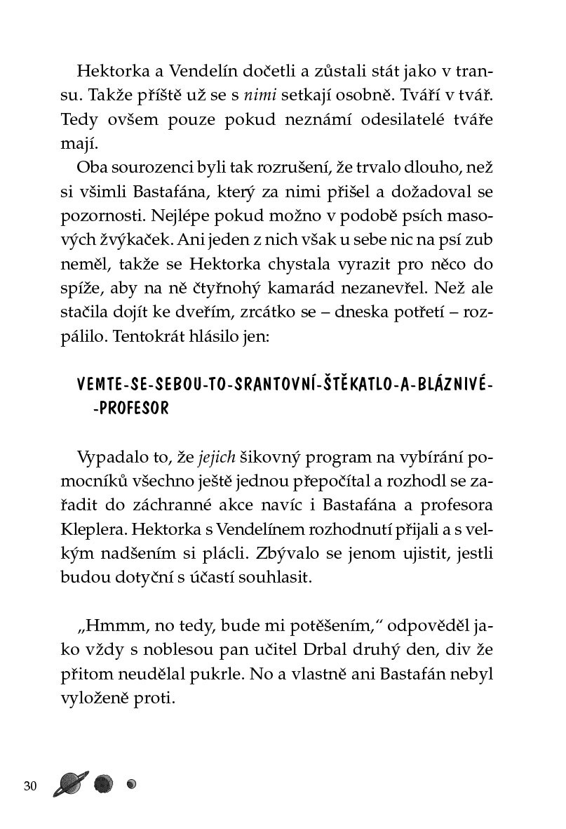 Hektorka je na první pohled nenápadná žákyně 6. A. Má neposedného mladšího bráchu Vendelína, ztřeštěného psa Bastafána a trochu pihatý nos. Jednoho dne najde Bastafán na louce podivné zrcátko. Ukáže se, že jde o dorozumívací zařízení, prostřednictvím kterého s nimi začnou komunikovat mimozemšťané. Proč? Jejich planeta je v ohrožení a oni vědí, že právě Hektorka, Vendelín, Bastafán a potrhlý fyzikář Drbal (přezdívaný také profesor Klepler) je můžou zachránit. Hektorka a Vendelín ani chvilku neváhají a spolu s Bastafánem a fyzikářem Kleplerem odlétají na malou fialovou planetku vstříc neobyčejnému dobrodružství.